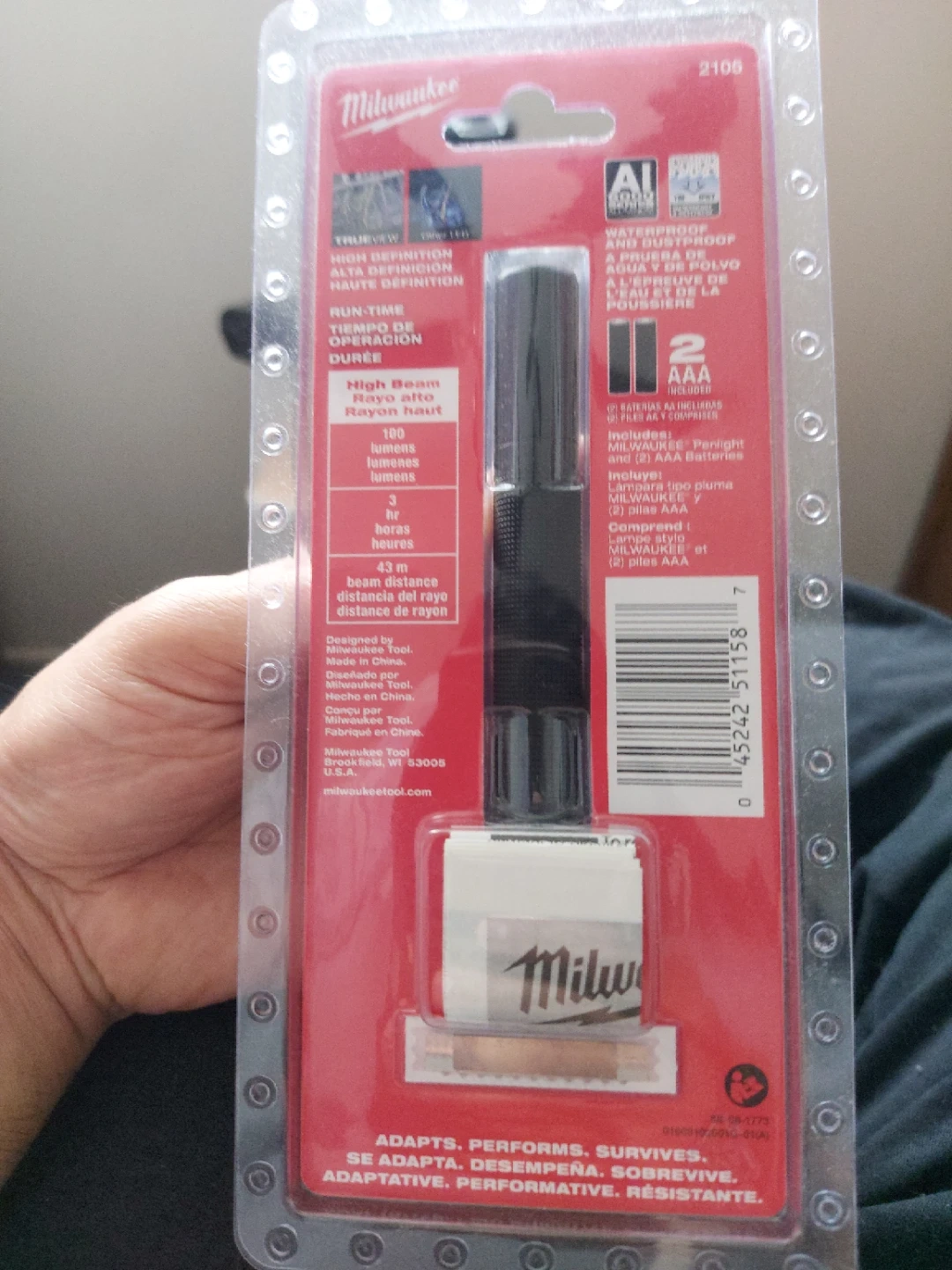 Milwaukee penlight with 100 lumens output. Includes 2 AAA batteries. It's waterproof and dustproof for tough jobs. Designed for hands-free use.