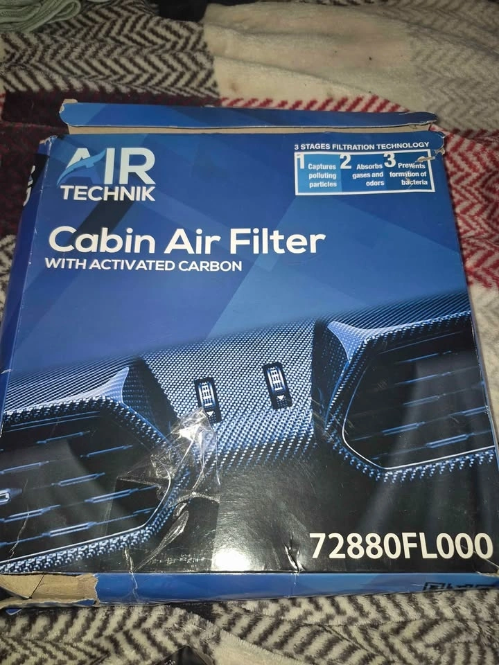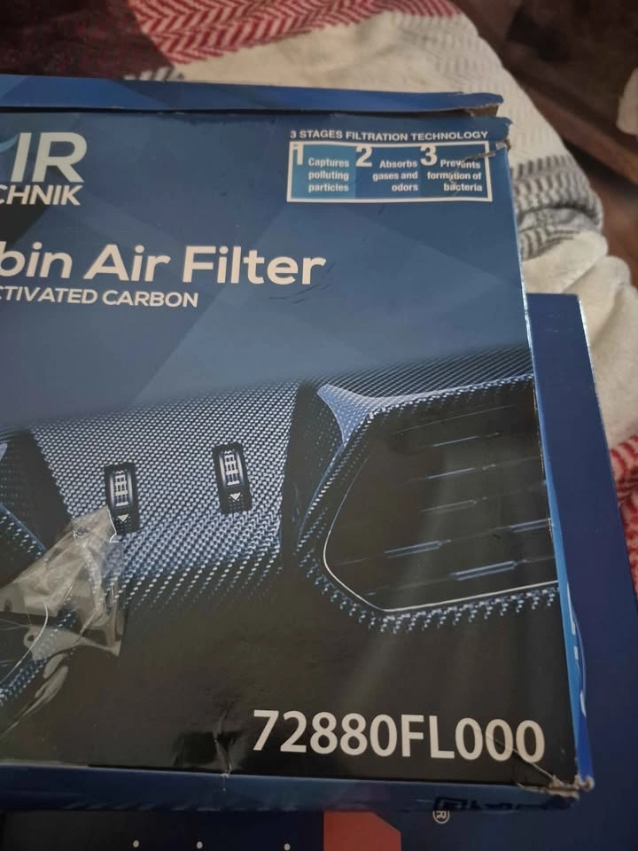New AIR TECHNIK Cabin Air Filter with activated carbon. Part number 72880FL000. Features 3-stage filtration for particles, odors, and bacteria. Fits Subaru Ascent (2019–2024), Crosstrek (2018–2024), Impreza (2017–2023), Legacy (2020–2024), Outback (2020–2024), XV (2018–2022); Mazda CX-9 (2016–2023); Toyota Corolla (2019–2024), RAV4 (2019–2024), Prius (2016–2024), Camry (2018–2024), Highlander (2020–2024); Hyundai Santa Fe (2013–2018), Santa Fe Sport (2013–2016), Santa Fe XL (2013–2019); Kia Sorento (2014–2015). Cross-references: Subaru OEM 72880-FL00A, 72880-FL500; Fram CF12436; Wix WP10320; NAPA Gold 230320; Purolator C31434. Also available: Fram CA11500 for Hyundai Santa Fe (2013–2018), Santa Fe Sport (2013–2016), Santa Fe XL (2013–2019), and Kia Sorento (2014–2015). Both filters are unused.