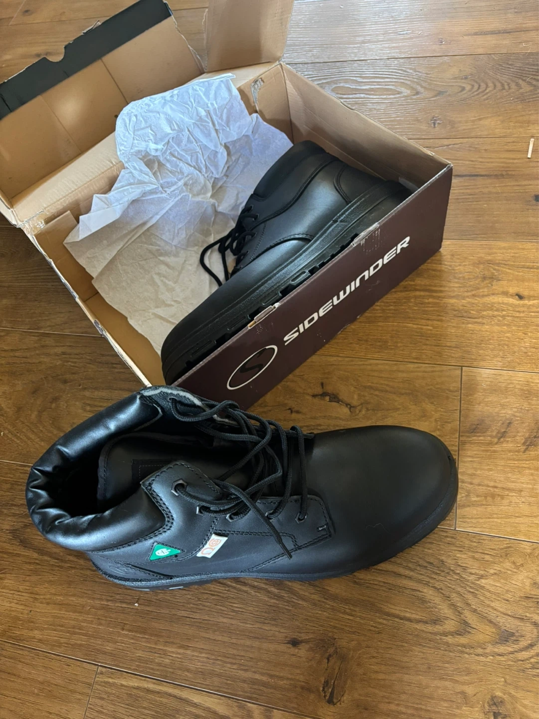 These Sidewinder 618 GTB work boots are black and size 47 EEE. They feature protective footwear with steel toe protection, as indicated by the SF logo.