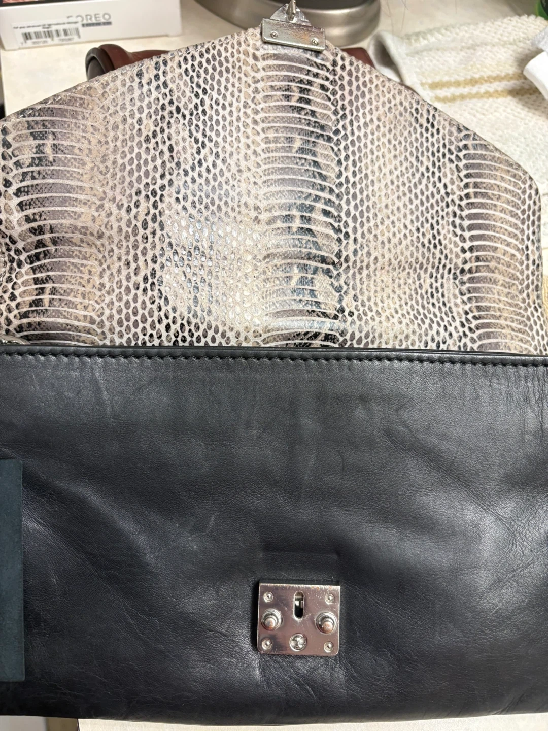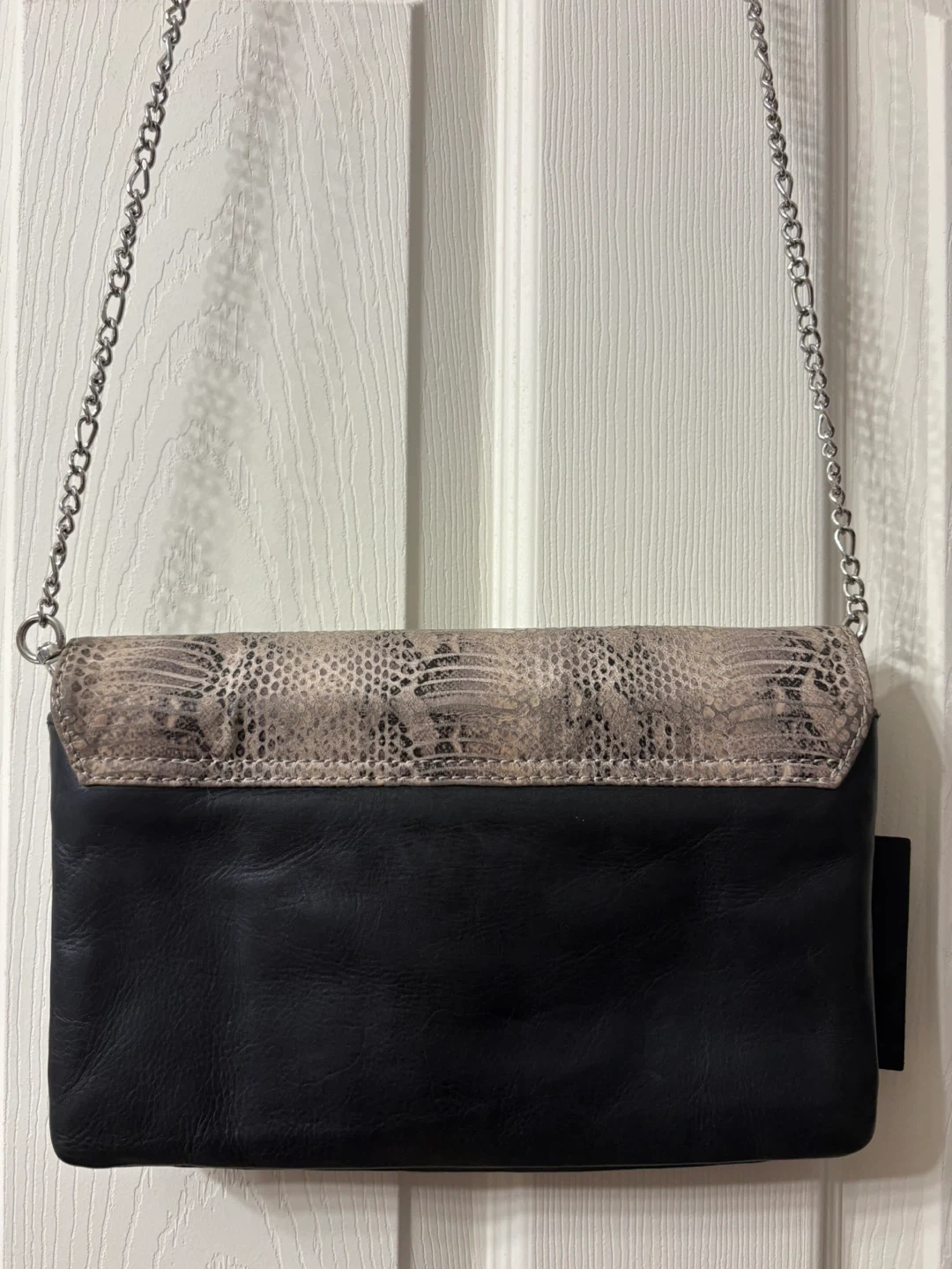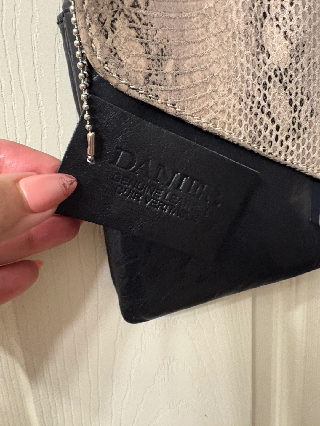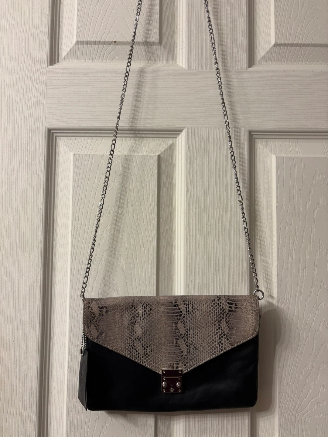 This DANIER clutch purse features a stylish black base with a textured snake print flap. It comes with a silver chain strap for versatile wear. Genuine leather. Perfect “like new” condition! Small elegant bag that fits a lot! Pick up in Chestermere.