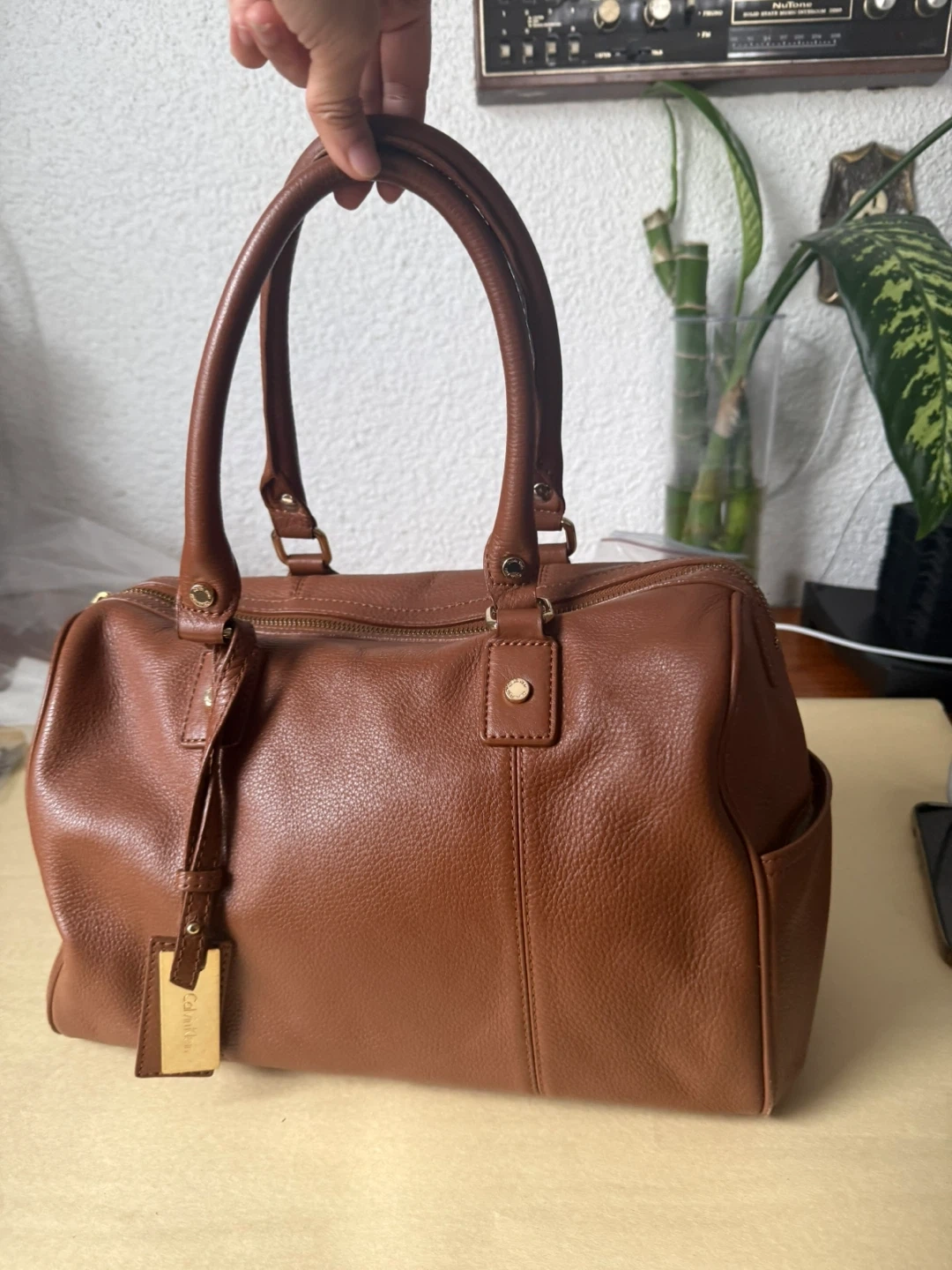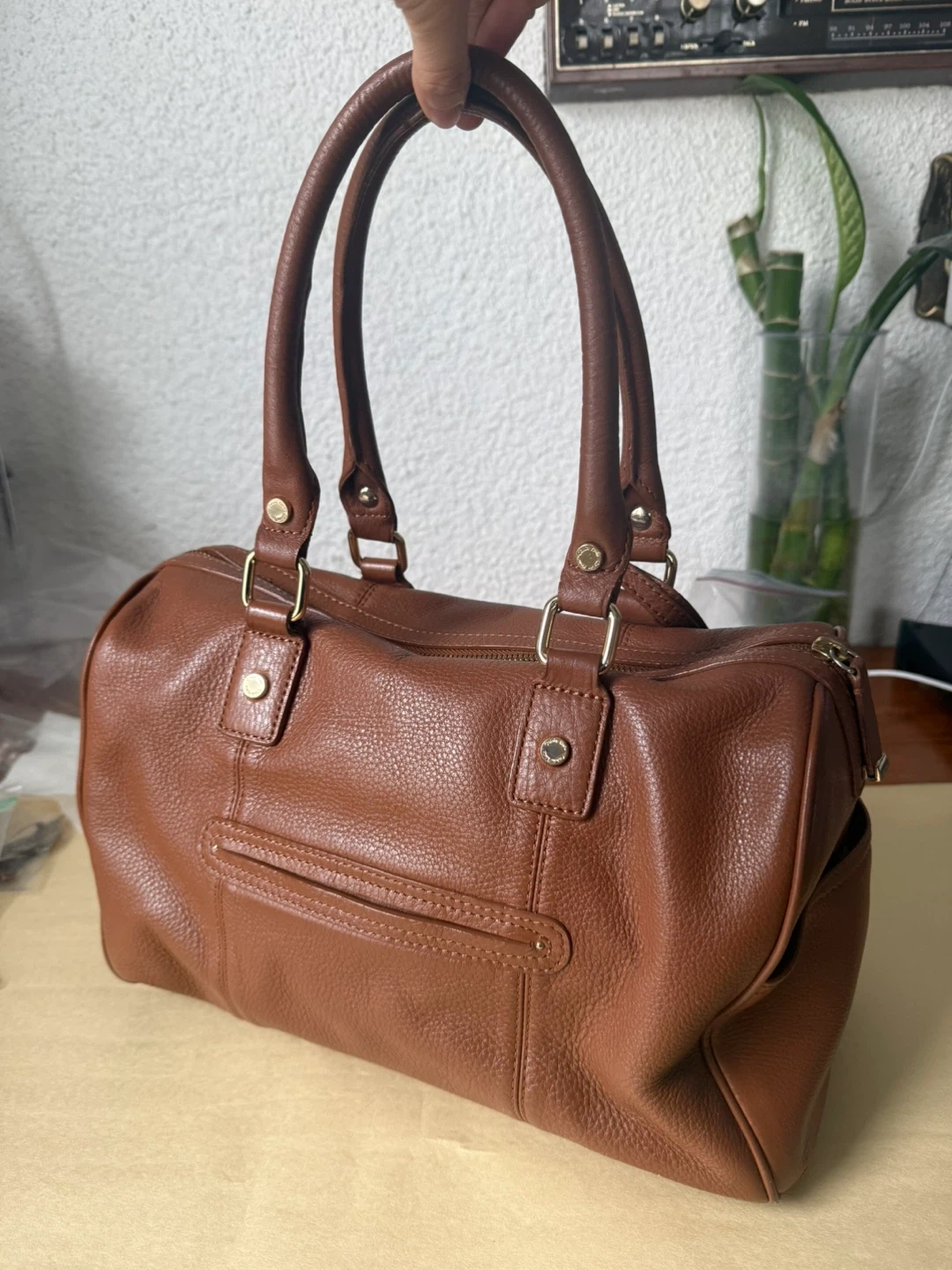This stylish Calvin Klein satchel handbag is crafted from genuine brown leather. It features a zippered main compartment and an exterior zip pocket for easy access to your essentials. This bag is perfect for everyday use, offering both fashion and function.