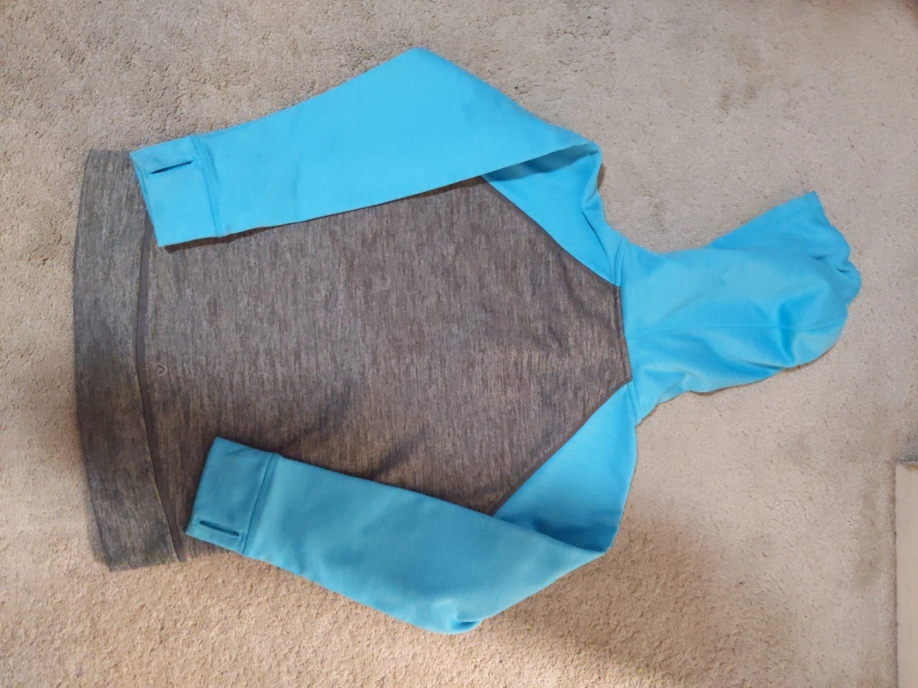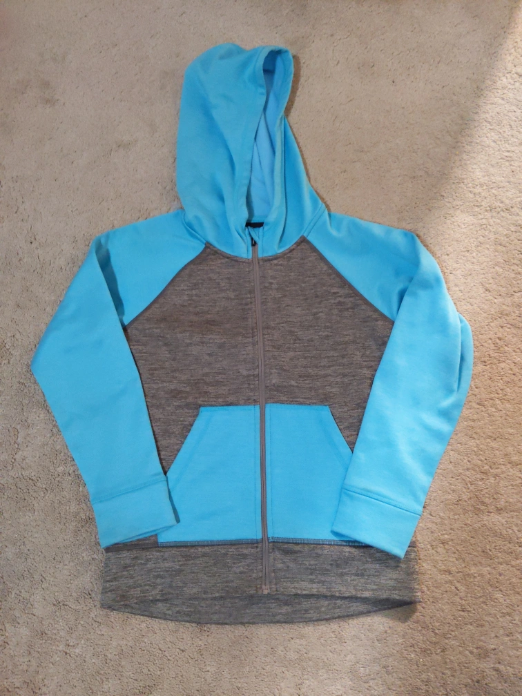 Blue and grey unisex kids hoodie with a zipper, hood and pockets. Size Medium. The size is medium and has 2 front pockets. The condition is like new and only worn a few times. It's soft from inside and good to wear in winter, fall, and spring. Bought from Costco. If you have any questions please contact me. Payment is cash only and pickup only please buy!