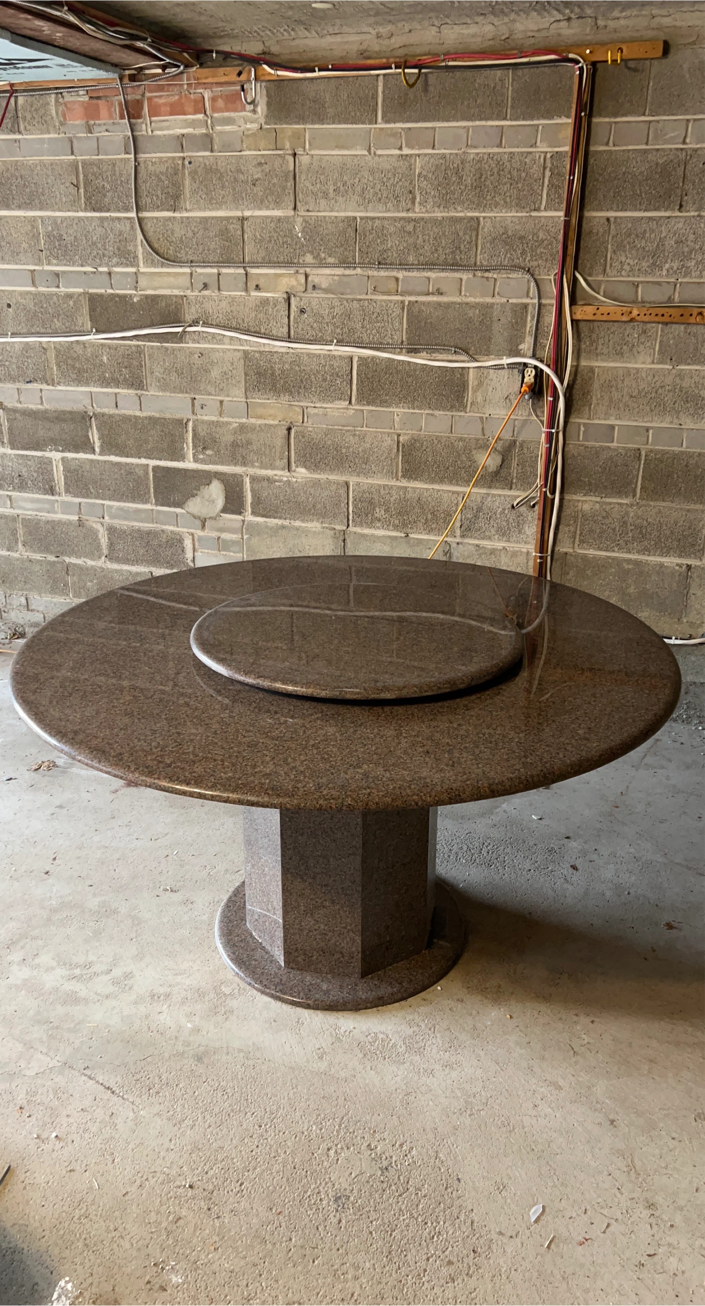 5Selling a beautiful 54” round solid granite dining table with matching granite pedestal base and center Lazy Susan. This is a serious statement piece – heavy, durable and perfect for family dinners or entertaining. Features: • 54” round solid granite tabletop • Matching round granite Lazy Susan (great for sharing dishes) • Sturdy granite pedestal base – lots of legroom, no corner legs in the way • Neutral speckled pattern that works with many décor styles • Seats 6–8 people comfortably • Polished finish – easy to wipe clean Condition: • Overall in excellent used condition • No major chips or cracks • Edges and surface are smooth and glossy Ideal for: • Dining room • Kitchen eating area • Restaurant / café / office meeting space Dimensions (approx.): • Tabletop diameter: 54” • Height: standard dining height (~30”) Notes: • Very heavy – will require at least 3–4 strong people to move • Buyer must arrange pickup from Yorkmills Bayview area • Base and top separate for transport Price: $400 OBO If the ad is up, it’s still available. Message me for any questions