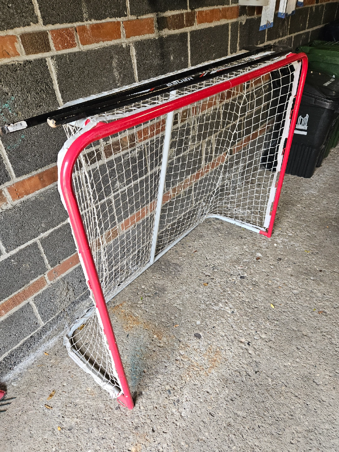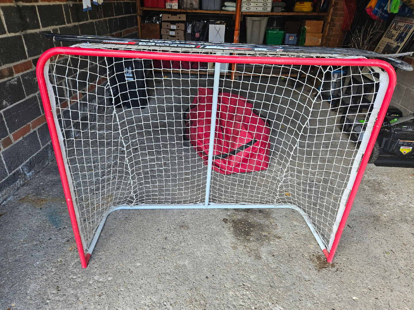 56Selling a hockey net and two hockey sticks. One stick is a Sherwood and the other is a Bauer. one left and one right