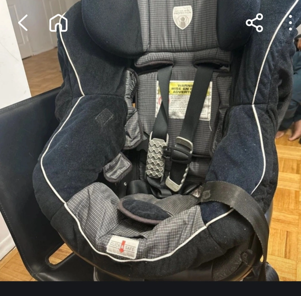 Used Black baby car seat with base. Seat has straps for security. A safe place for your little one to be while on the road.