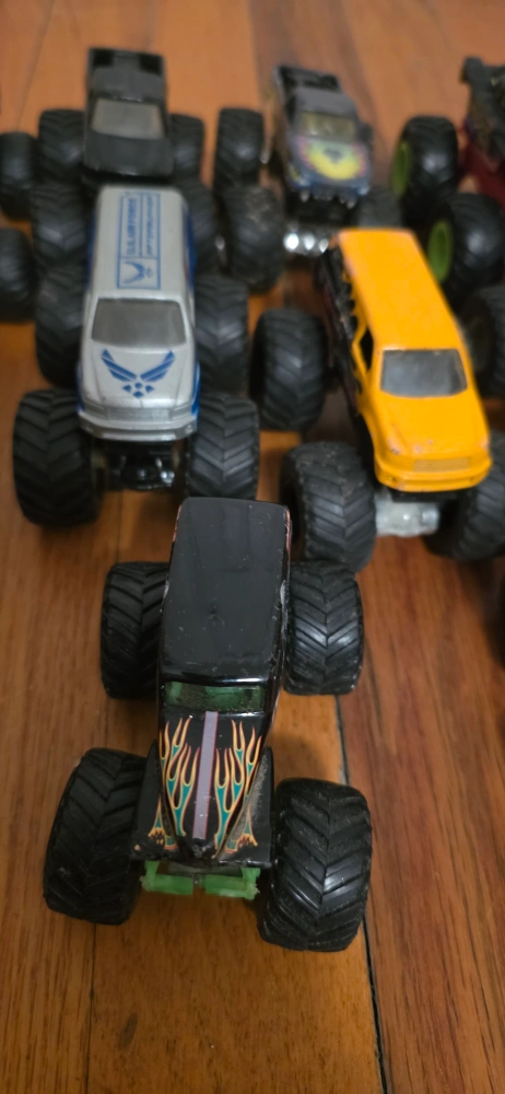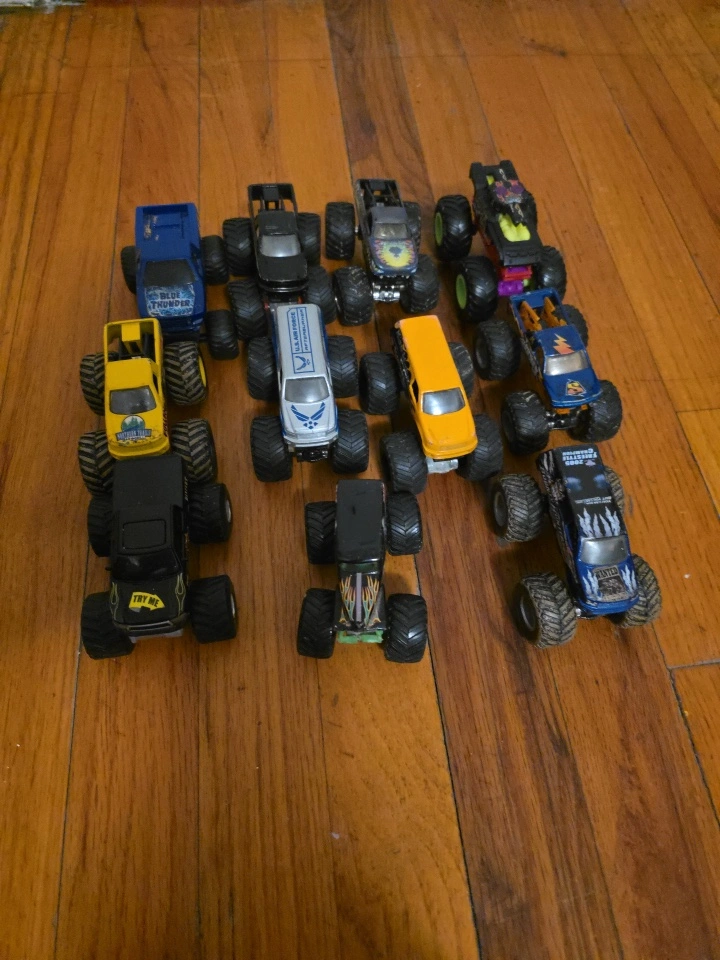 Assortment of monster trucks. Different colors and designs. Great collection for children. Playing with them can bring peace to the heart.