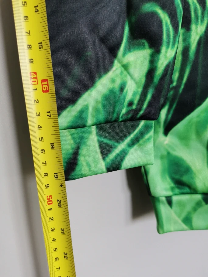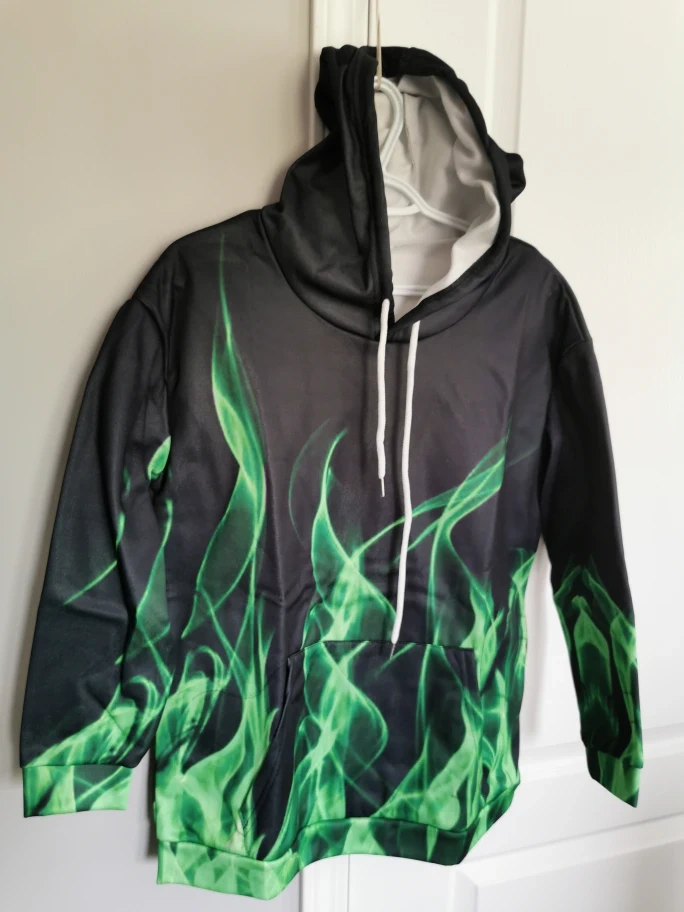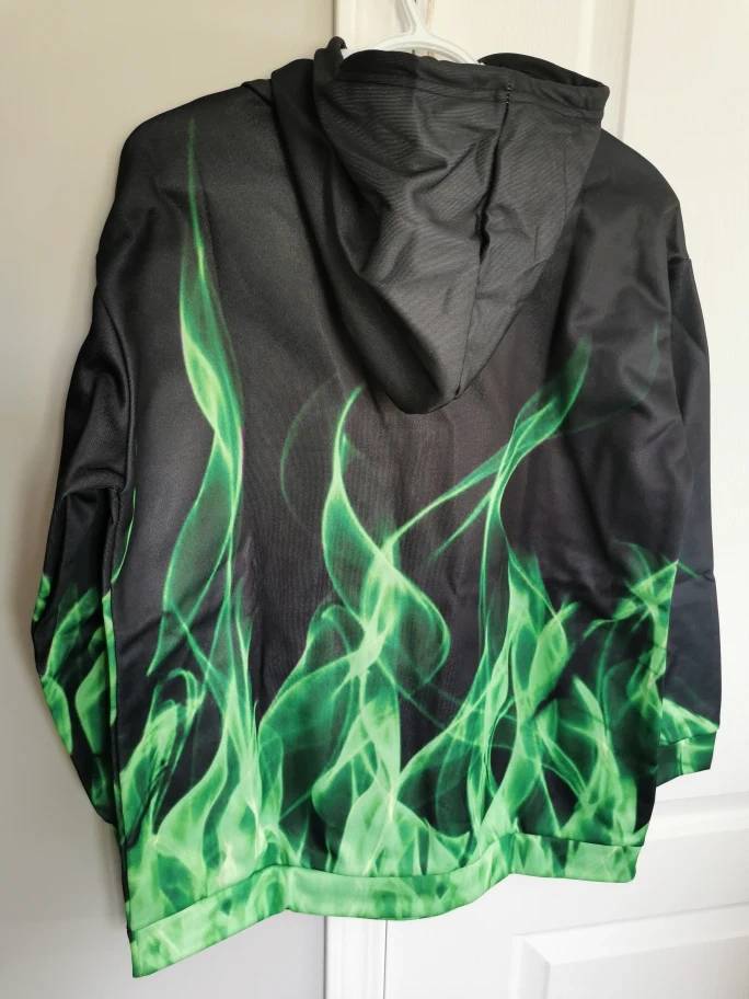 This is a new green flame hoodie in size medium, featuring a unique design and comfortable fit, perfect for casual wear or adding a statement piece to your wardrobe.