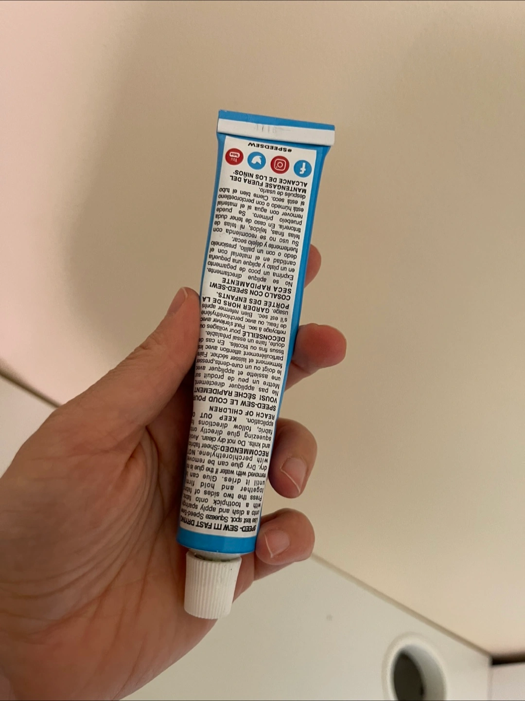 Tube of fabric glue. Features blue and white packaging. With this glue you will be able to complete many sewing projects with ease and without the need for needles and thread, offering a sense of peace in the creative process.