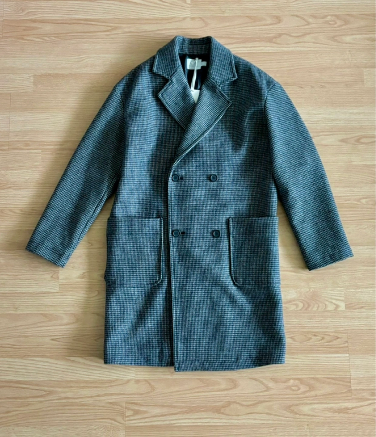 A stylish houndstooth pattern overcoat. Long sleeves with a double-breasted closure. Has front pockets. A piece that will get you through the coldest days with style.