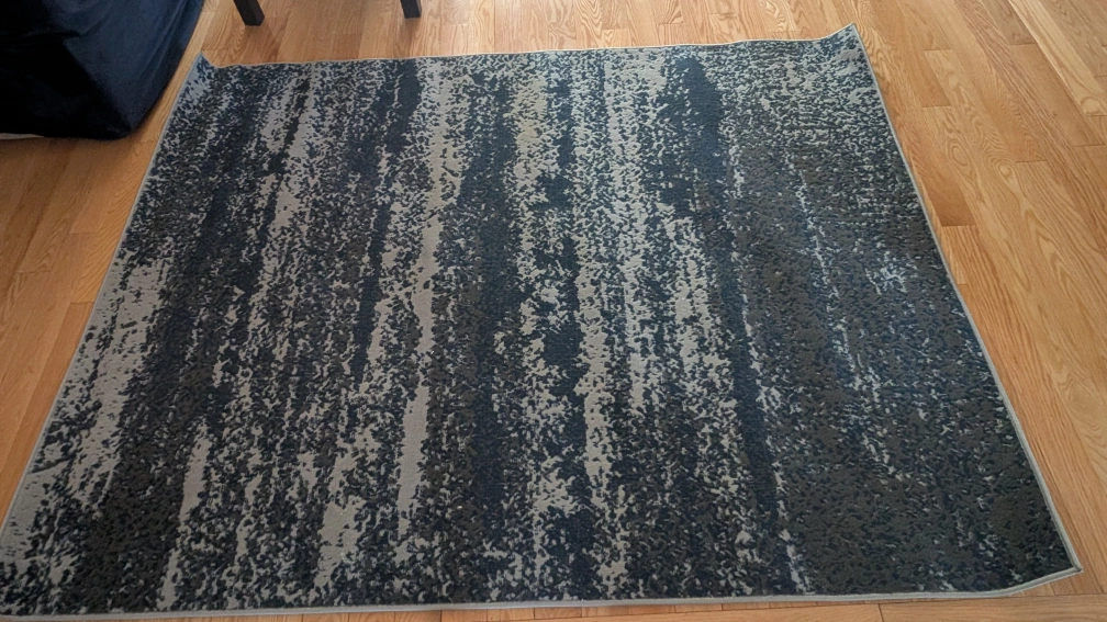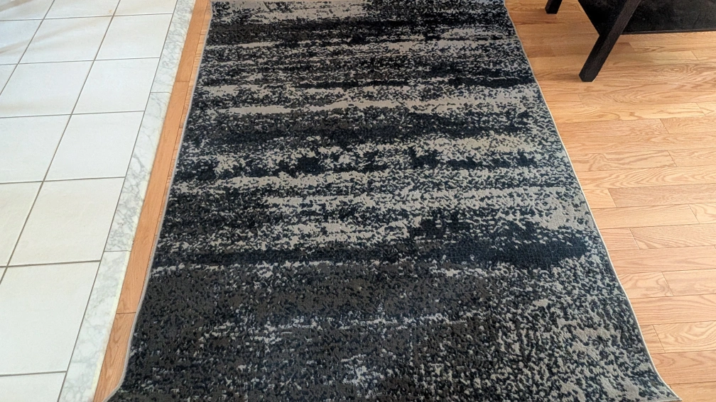 Dark and light grey hues. Textured, graphic design. Can bring warmth and style to any space.