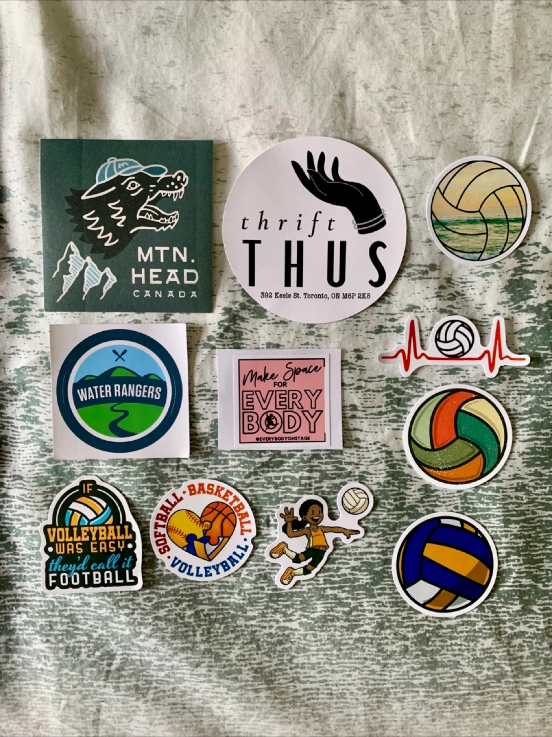 Extra stickers that I have. Only the Thrift Thus one and the volleyball stickers are vinyl. Take one or take a few or take them all!