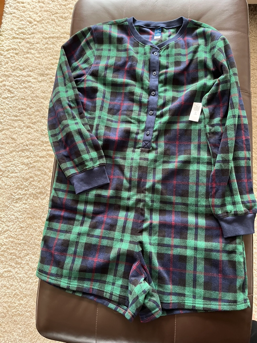 Cozy, long-sleeved onesie. Features a plaid pattern. Has a button-up front. Wear this onesie on lazy weekend mornings.