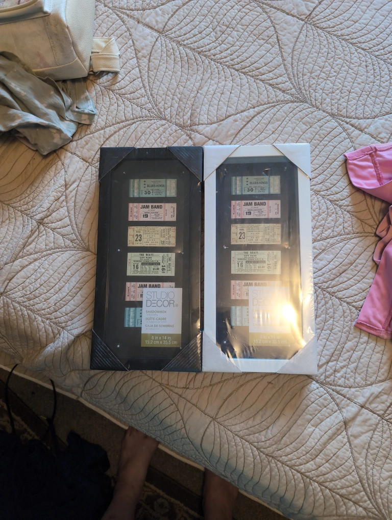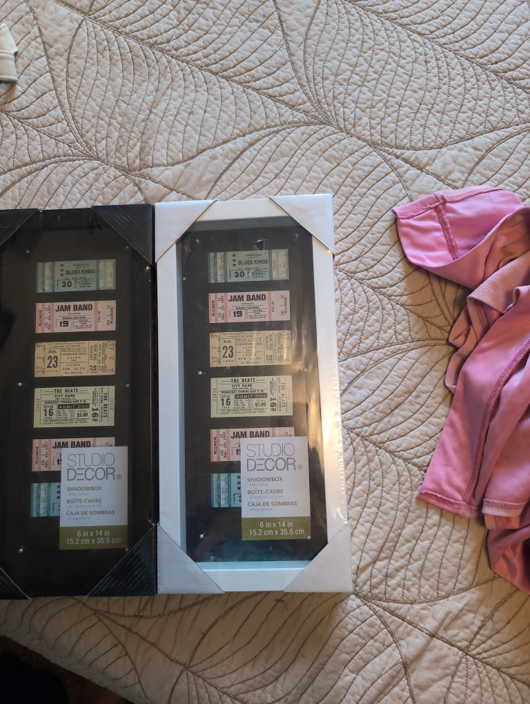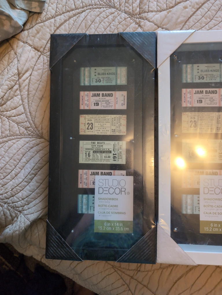 These shadowboxes would be perfect for displaying memories. They are rectangular. Each one includes a display area for multiple items. They appear to have a textured look to the outer frame. They are new, still in the original packaging. These are a great way to organize and remember those important events.