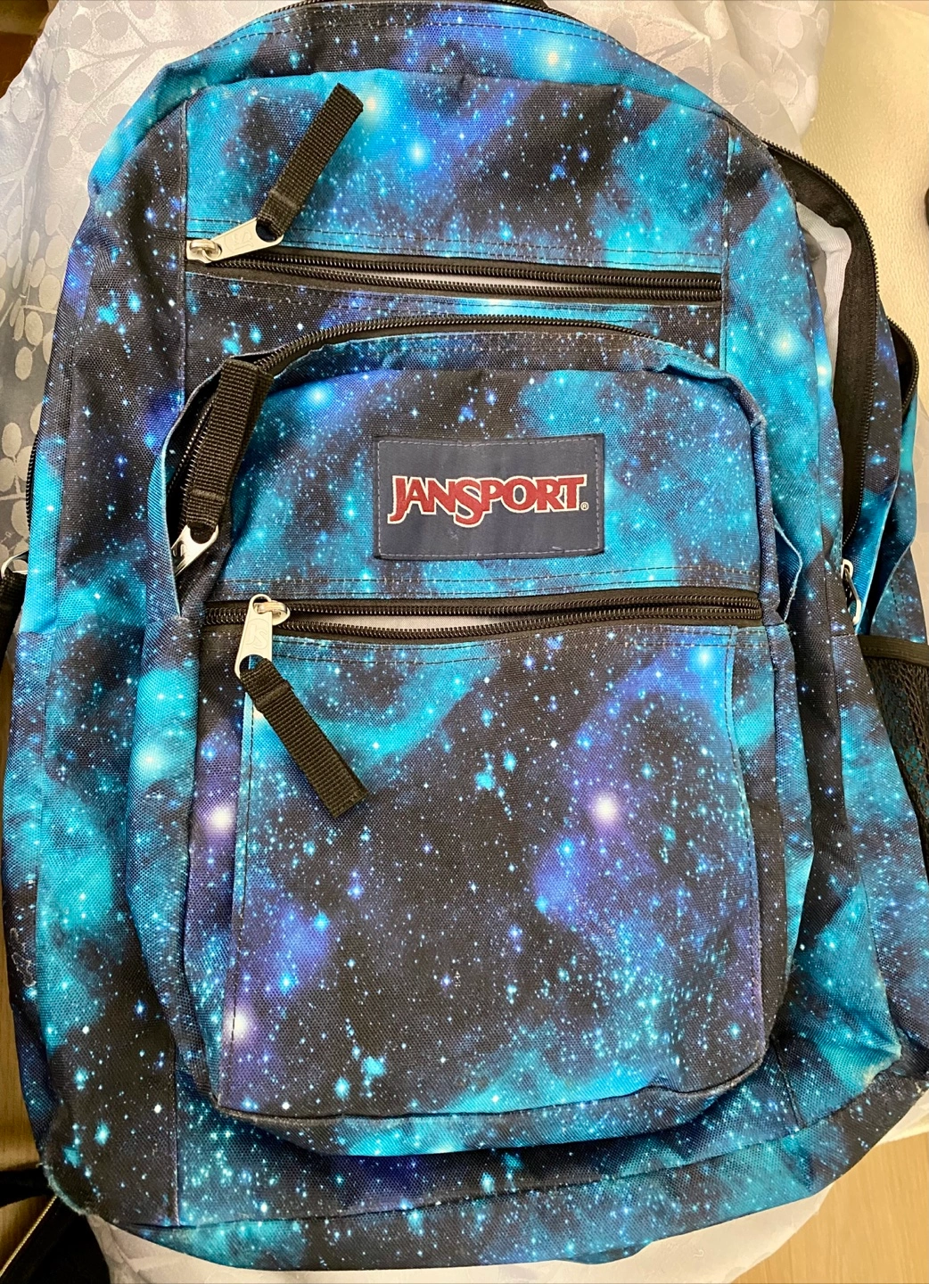 Gently used, beautifully designed lovely backpack. Features a vibrant galaxy print. Multiple zippers. Mesh side bottle pocket. This backpack is great for students and adults with plenty of room! All zippers and compartments in great working order, no rips or wear inside very clean, ready to be used!
