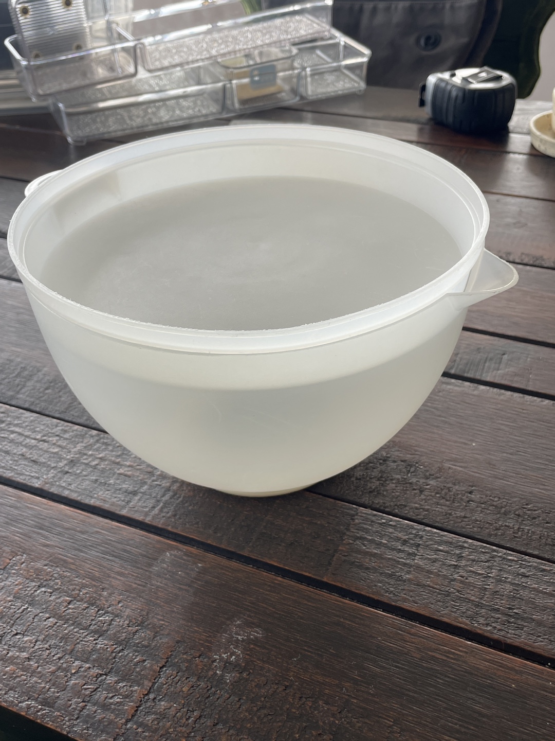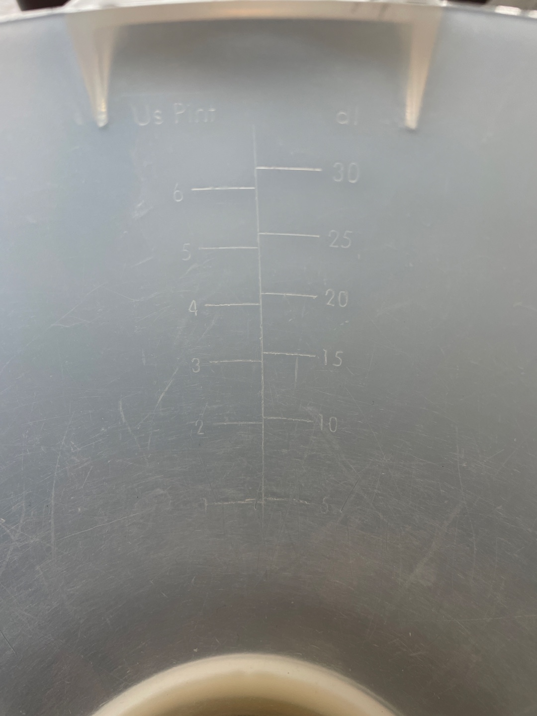 plastic mixing bowl with a lid. Has spout on one side and handle/hanger on the other. 6US pints/3litres/30 decilitres with marking on the inside.