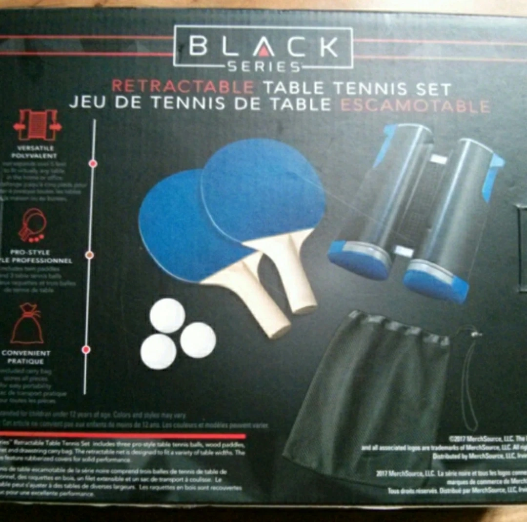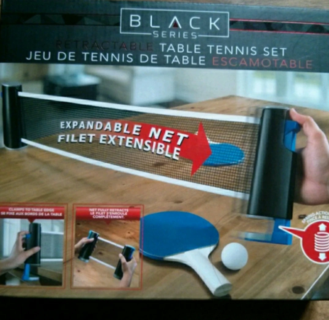A table tennis set. Includes paddles, net, and balls. Great for entertaining a couple of friends for a friendly game. The net is expandable.
