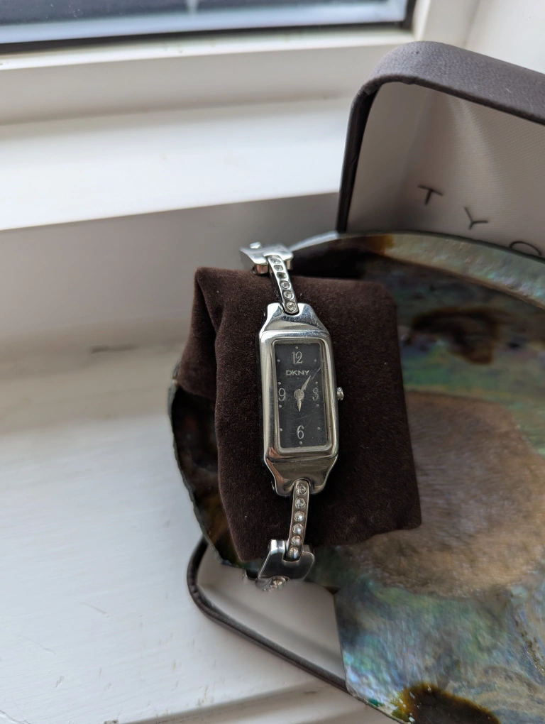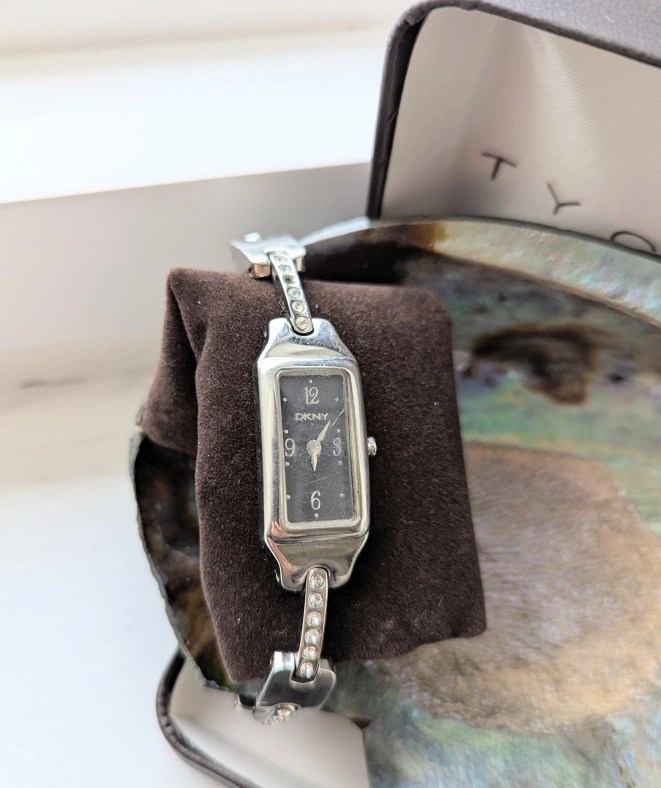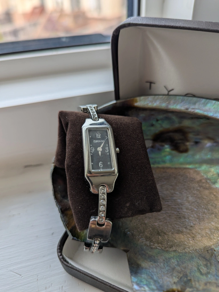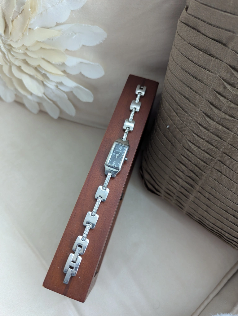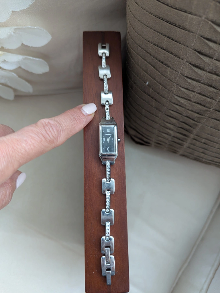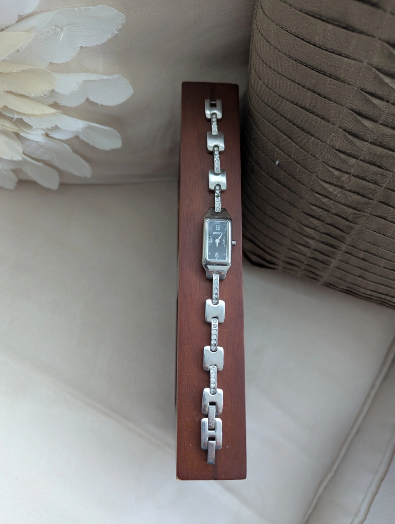 DKNY Rectangular watch with black face . The watchband is made of individual rectangular silver tone pieces with rhinestones in the middle. A great and elegant accessory for any outfit.