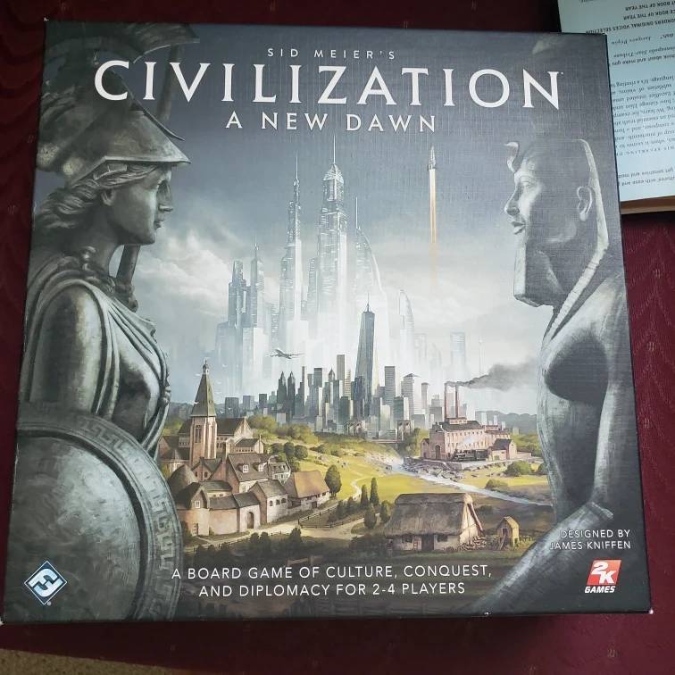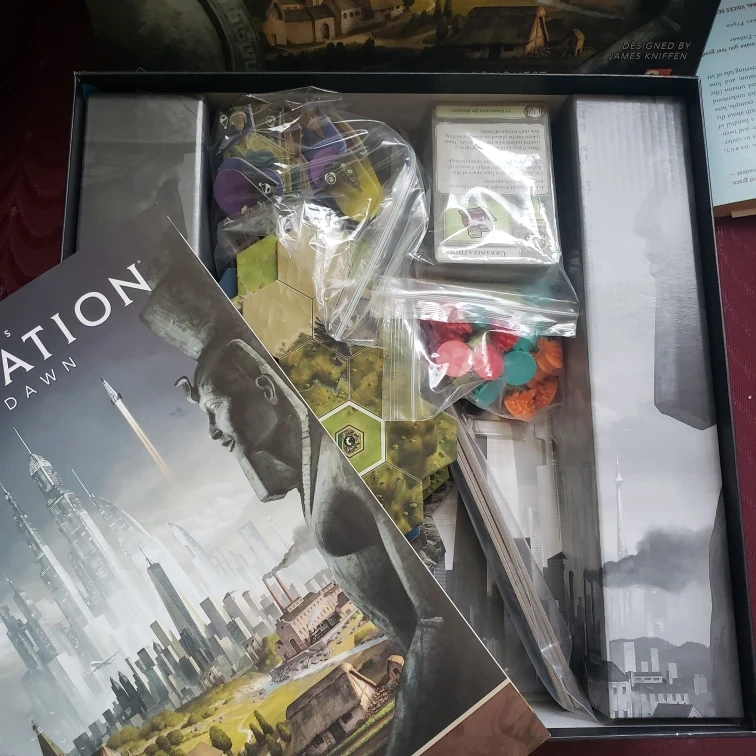A board game with various components and instructions. Mint condition. Inside the box, you can see components still in bags. The box features a beautiful illustration. A fun way to relax on a rainy day.