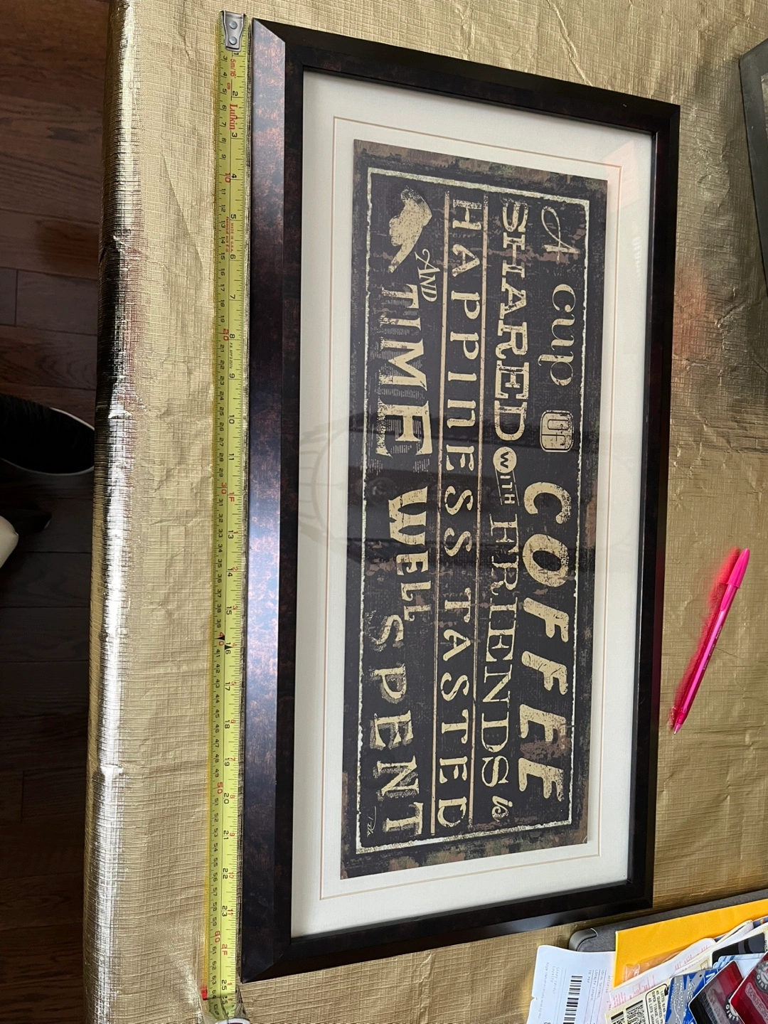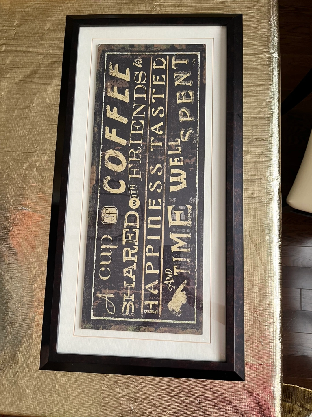 Decorative art piece. Dark frame with a beige matte. Features words that say "A cup of coffee shared with friends is happiness tasted and time well spent". Would look great in a kitchen or dining room.