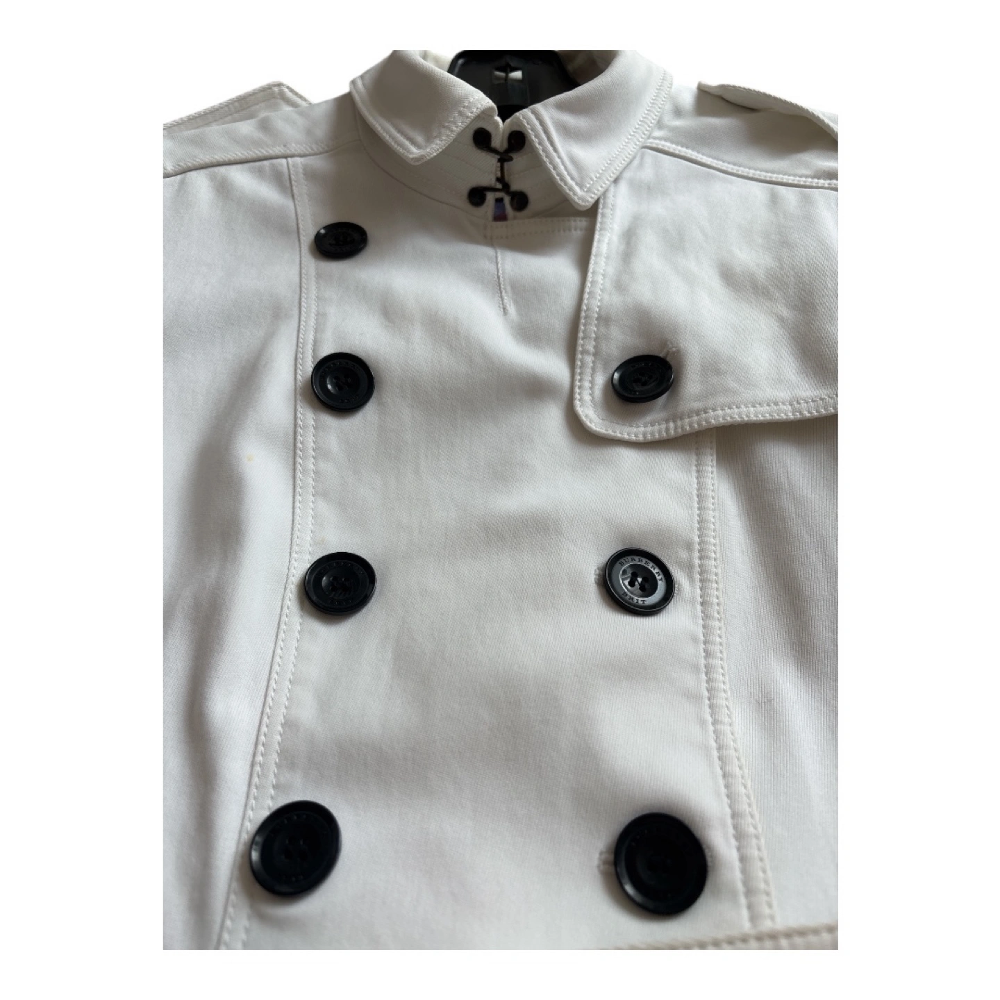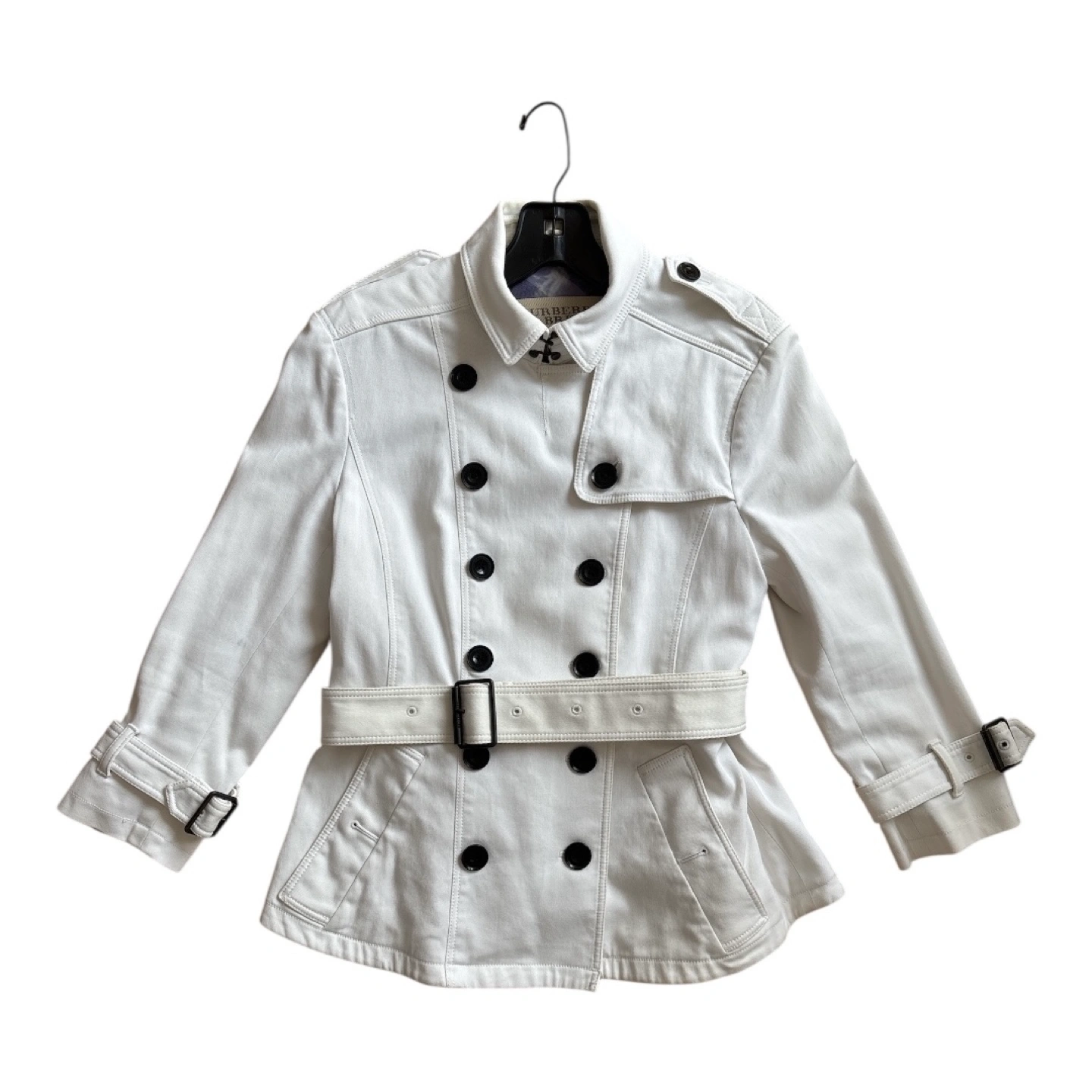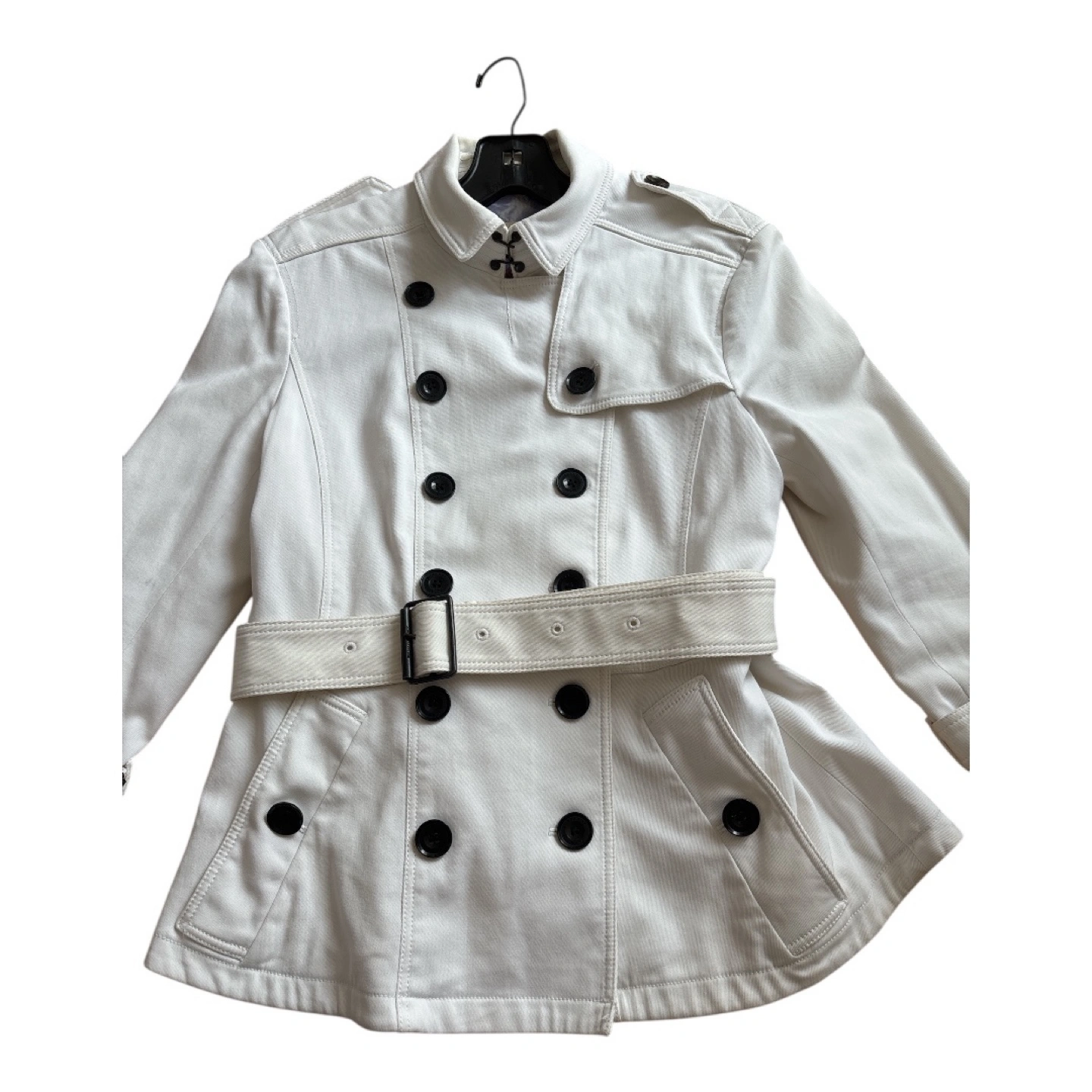 A beautiful white Burberry trench coat. It is a double-breasted style. Features large black buttons and a belt.