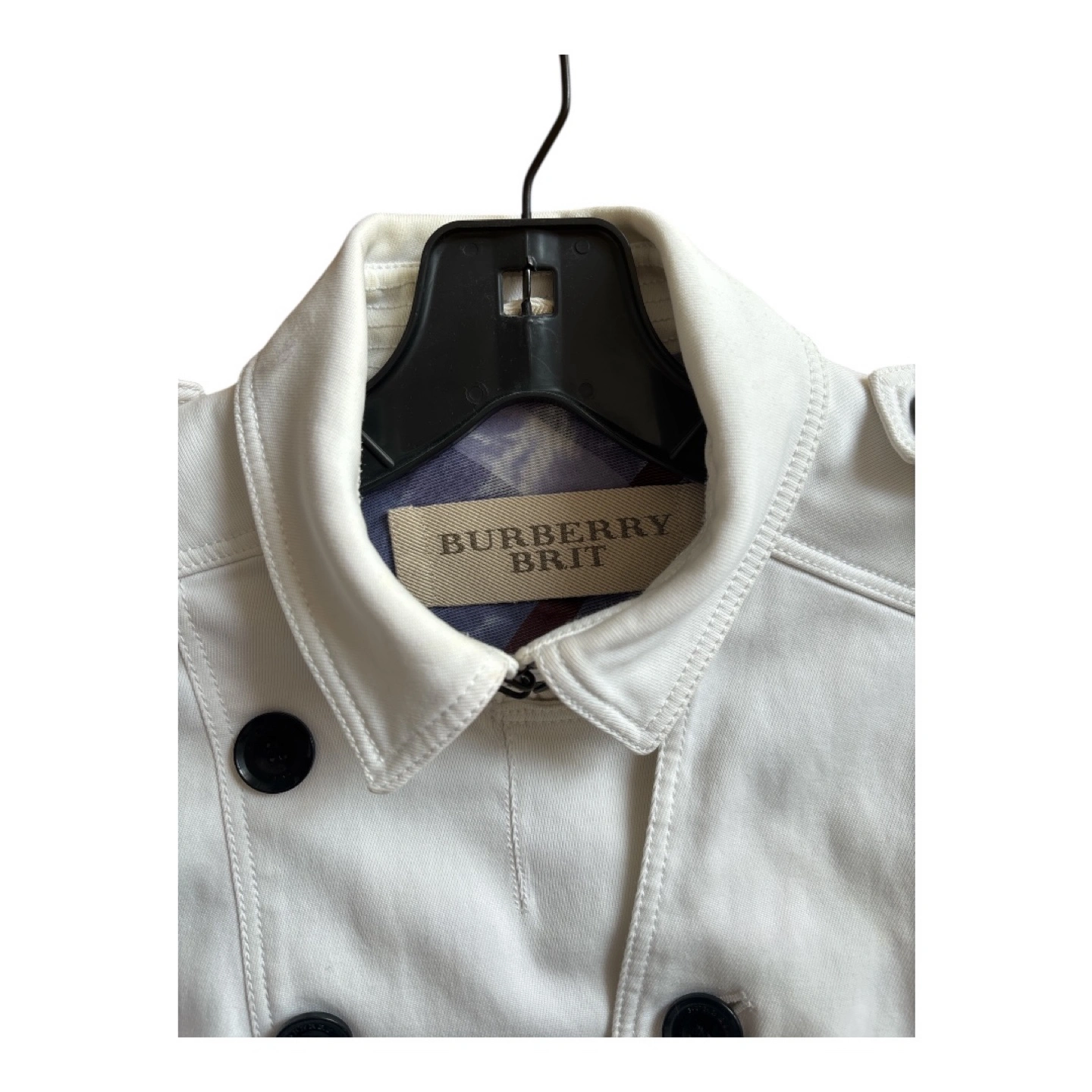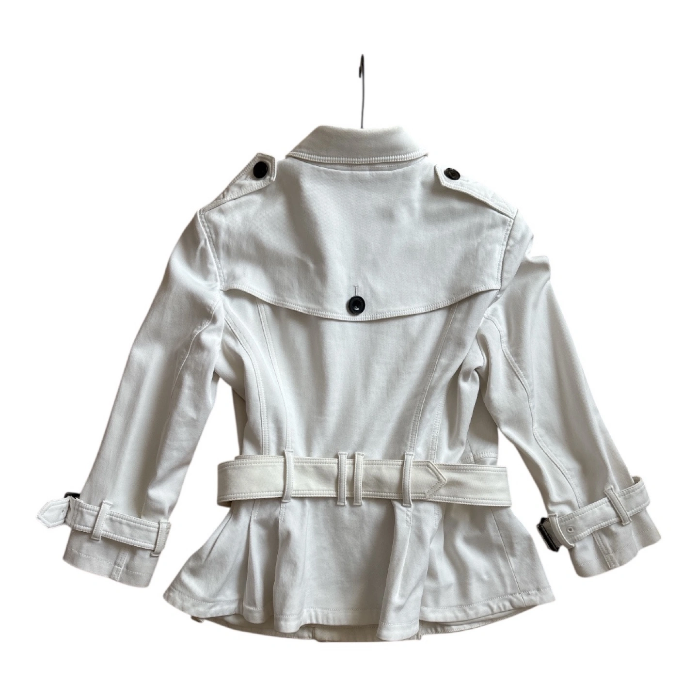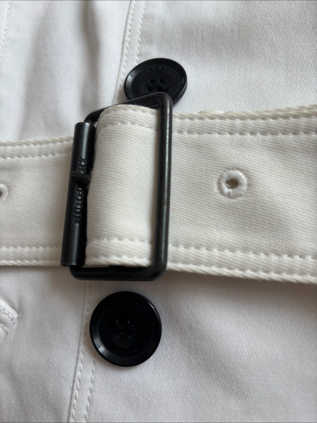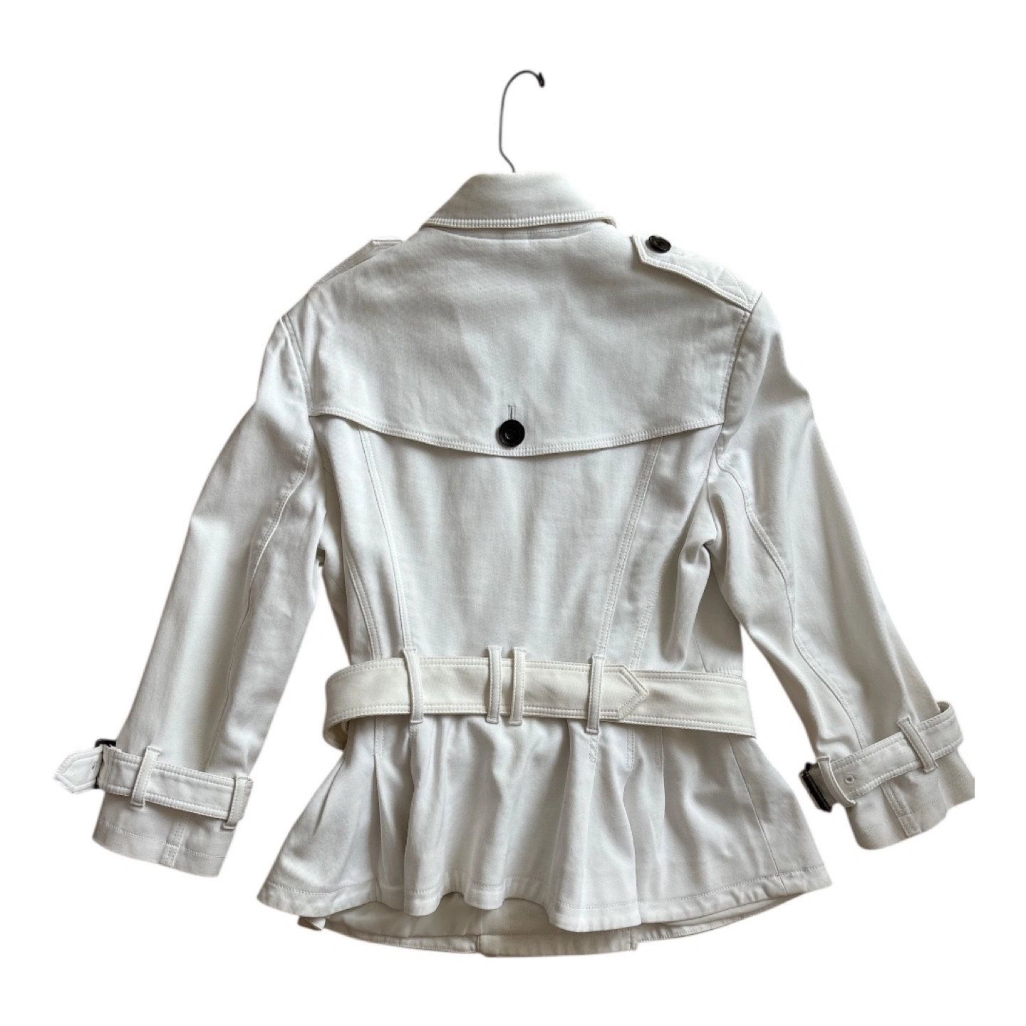 A beautiful white Burberry trench coat. It is a double-breasted style. Features large black buttons and a belt.