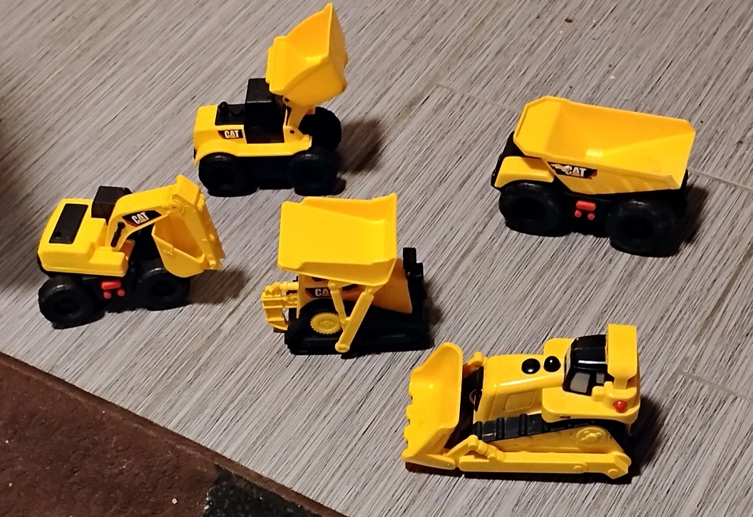 A collection of CAT construction trucks. Some are yellow and black. They have different features. This is a great set for imaginative play.