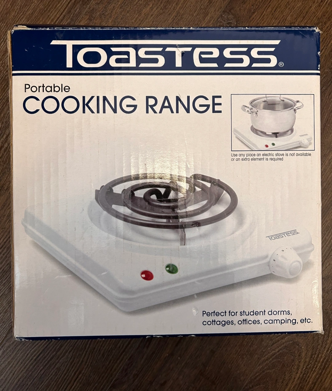This is a brand new Toastess portable cooking range, perfect for dorms, camping, or anywhere you need an extra cooking element! It features a durable design and simple controls for easy use.