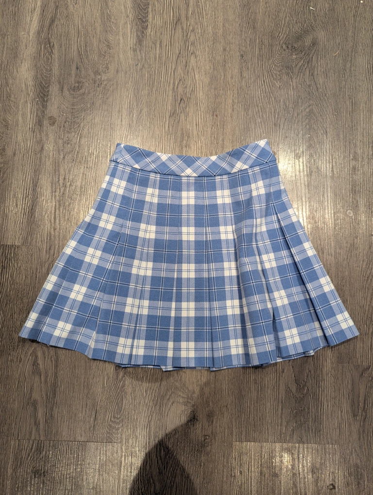 This mini skirt has a flattering pleated design, as well as a zipper closure. Featuring a light blue and white plaid pattern.