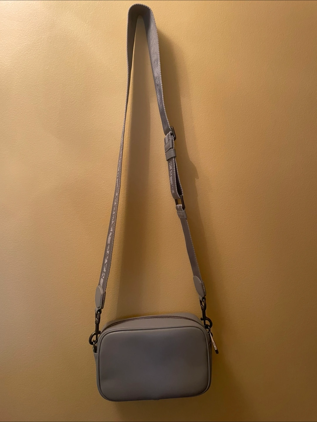 A lovely crossbody bag. Made in a solid, light grey colour. Features a long adjustable strap, and a zipper closure. You can carry your essentials in it with ease at any time of the day.