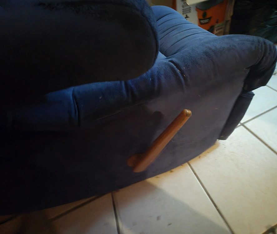 A navy blue recliner chair. It features a long back. Includes armrests. A wooden lever is present. This would be an excellent spot to read and relax after a long day.
