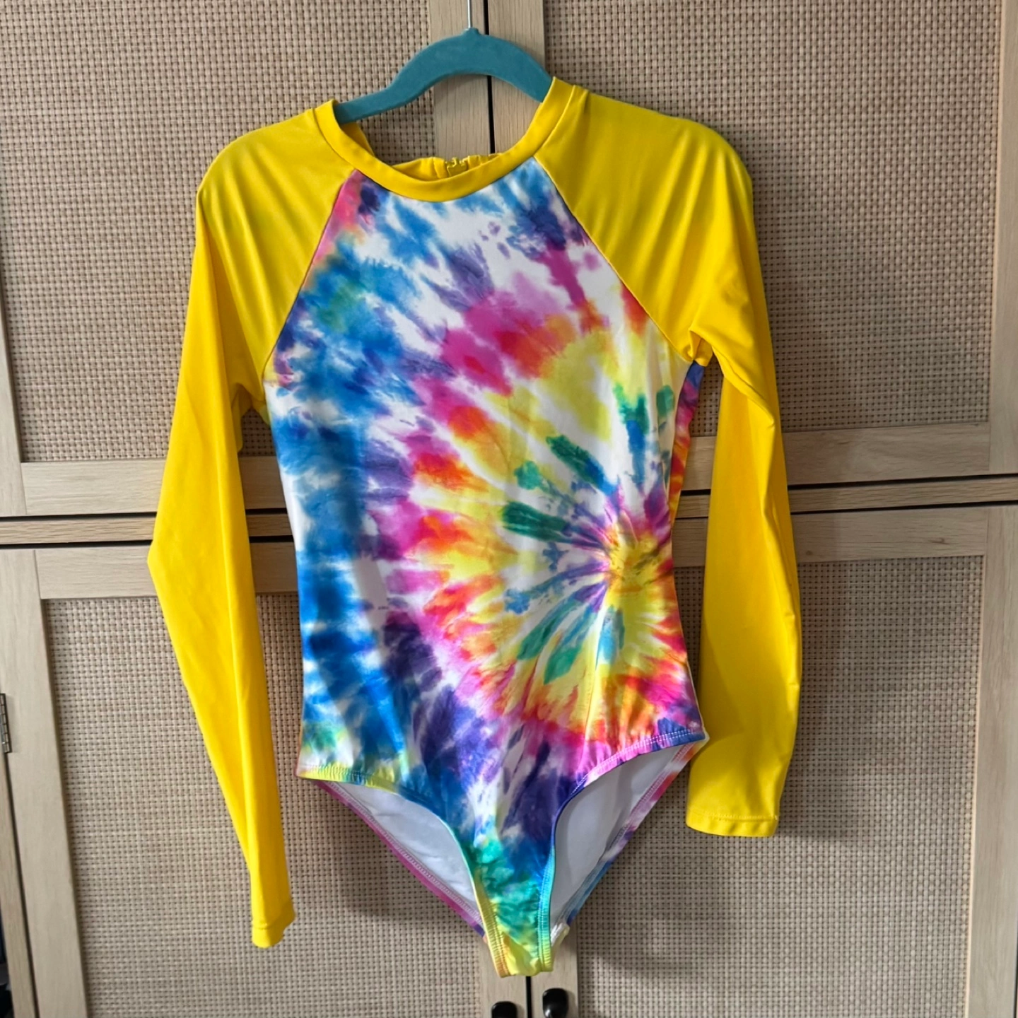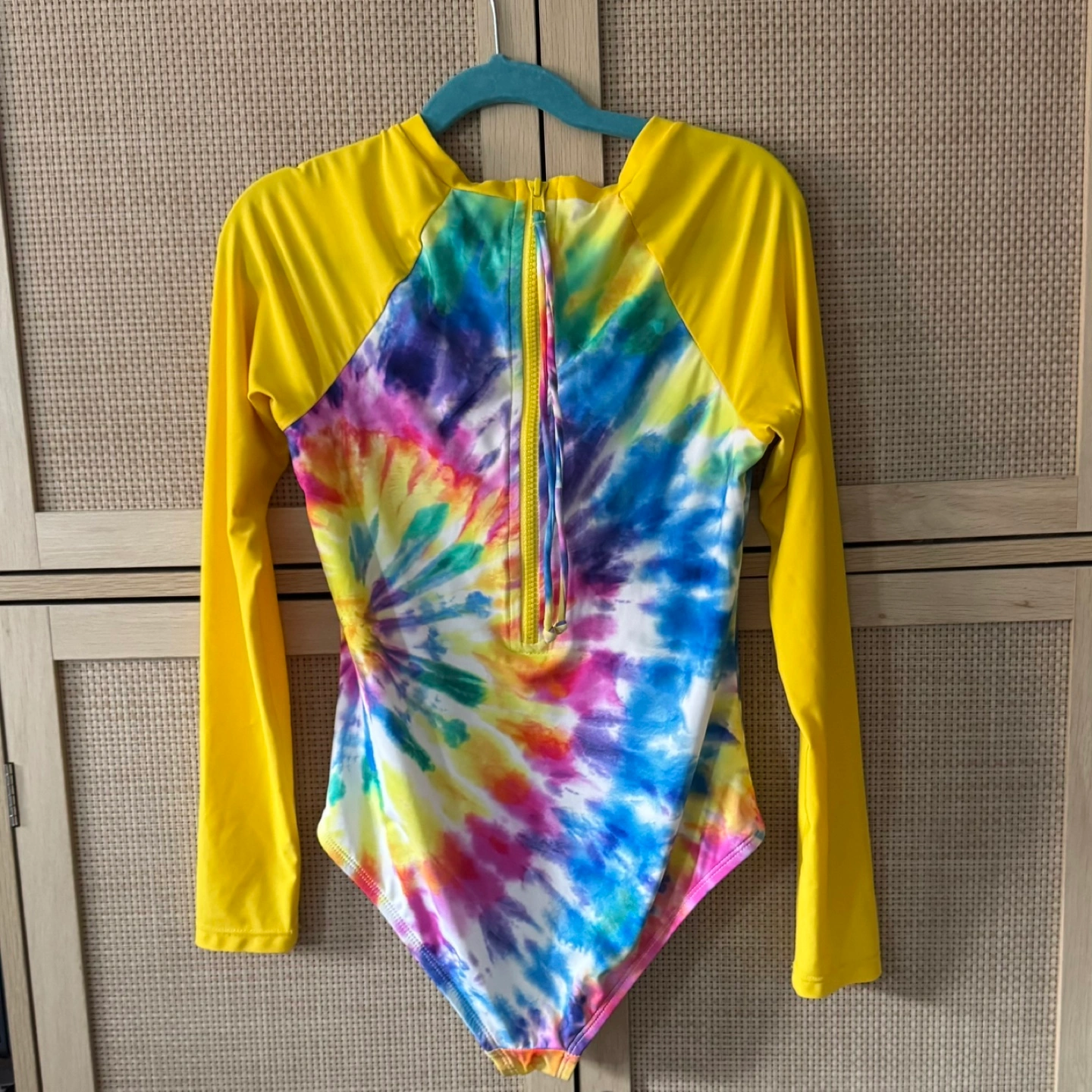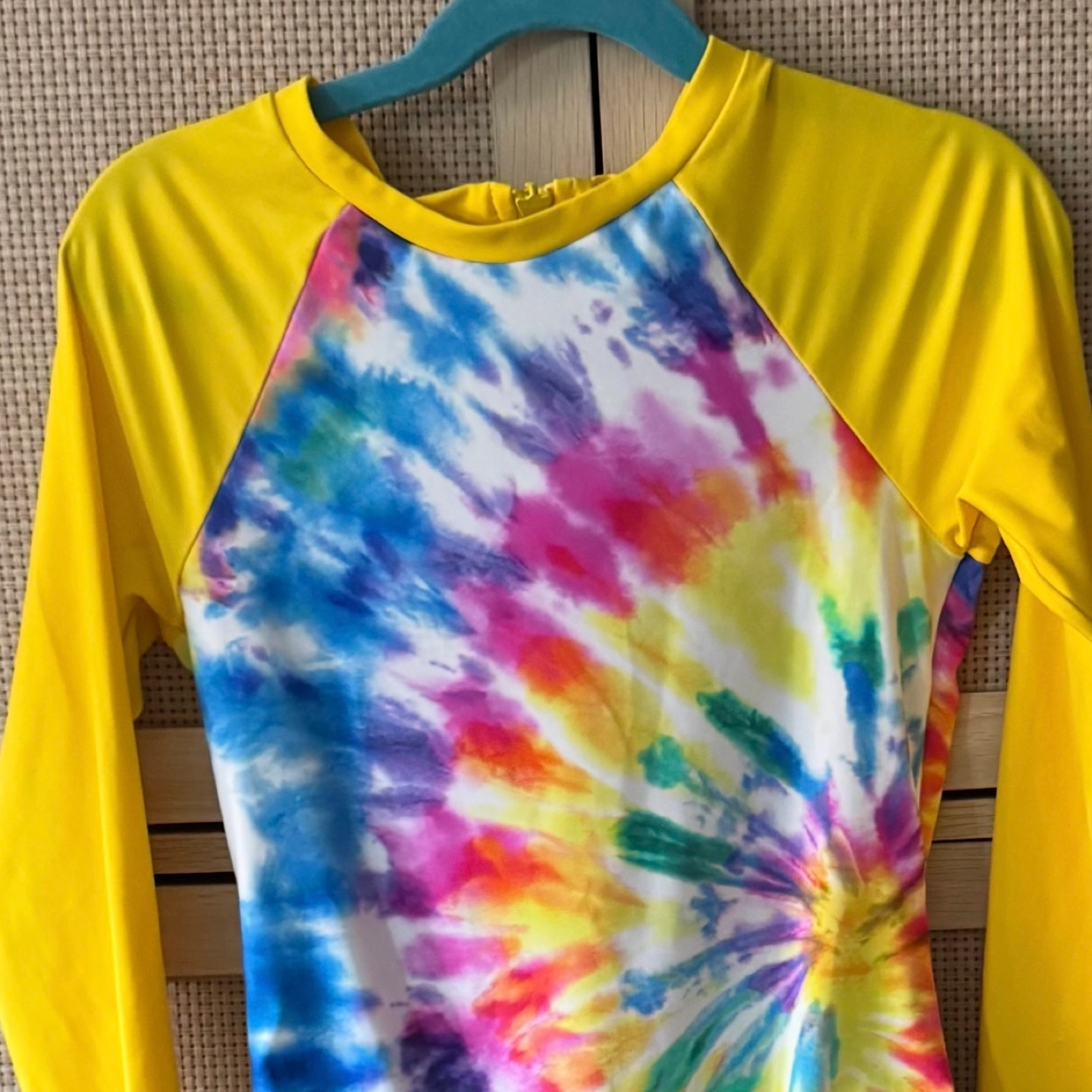 Hobie tie dye rash guard swimsuit. Bright yellow long sleeves. Colorful tie dye center. Zipper in the back. Enjoy wearing this swimsuit while spending a relaxing day at the beach or pool. Worn only a few times. Excellent condition.Retailed for $56