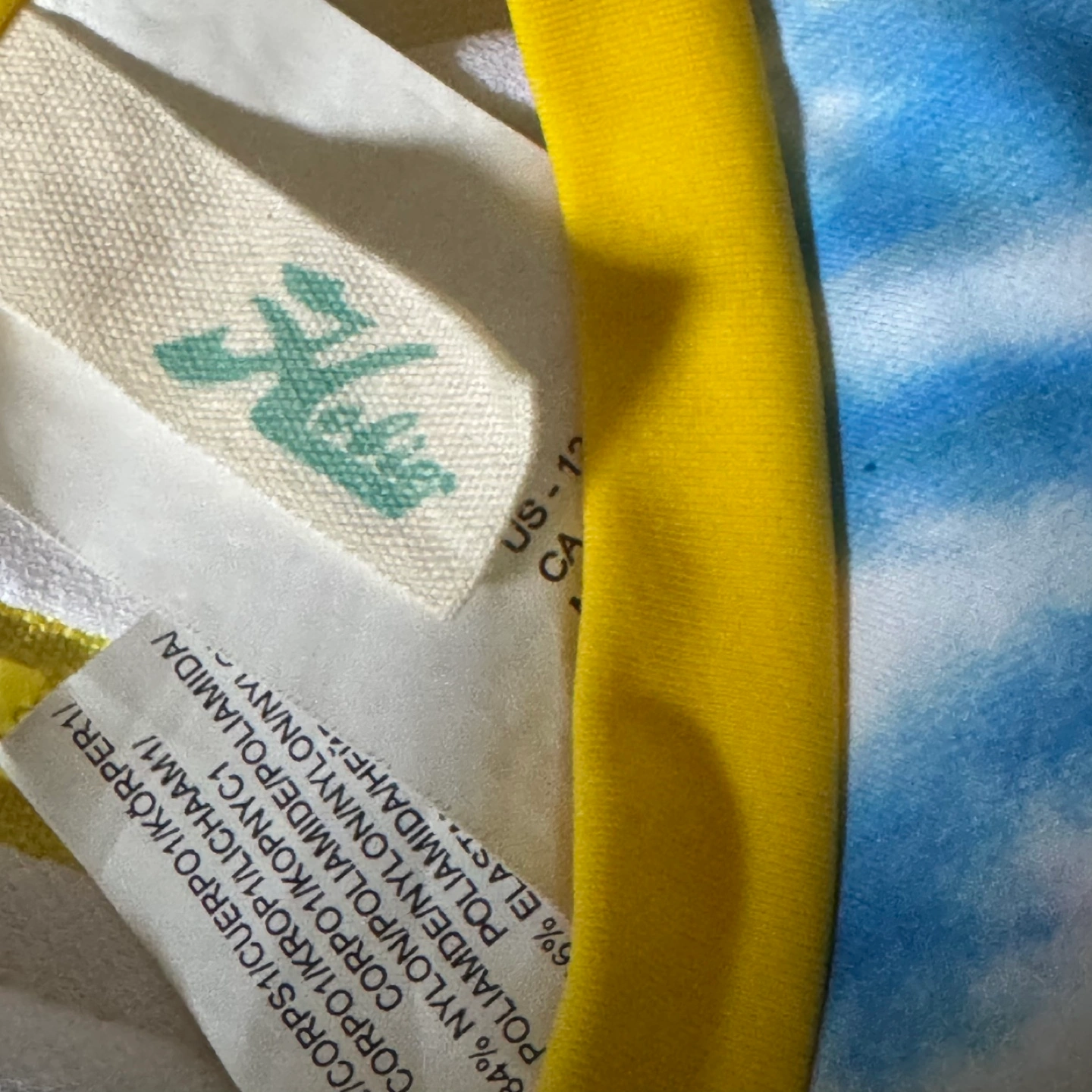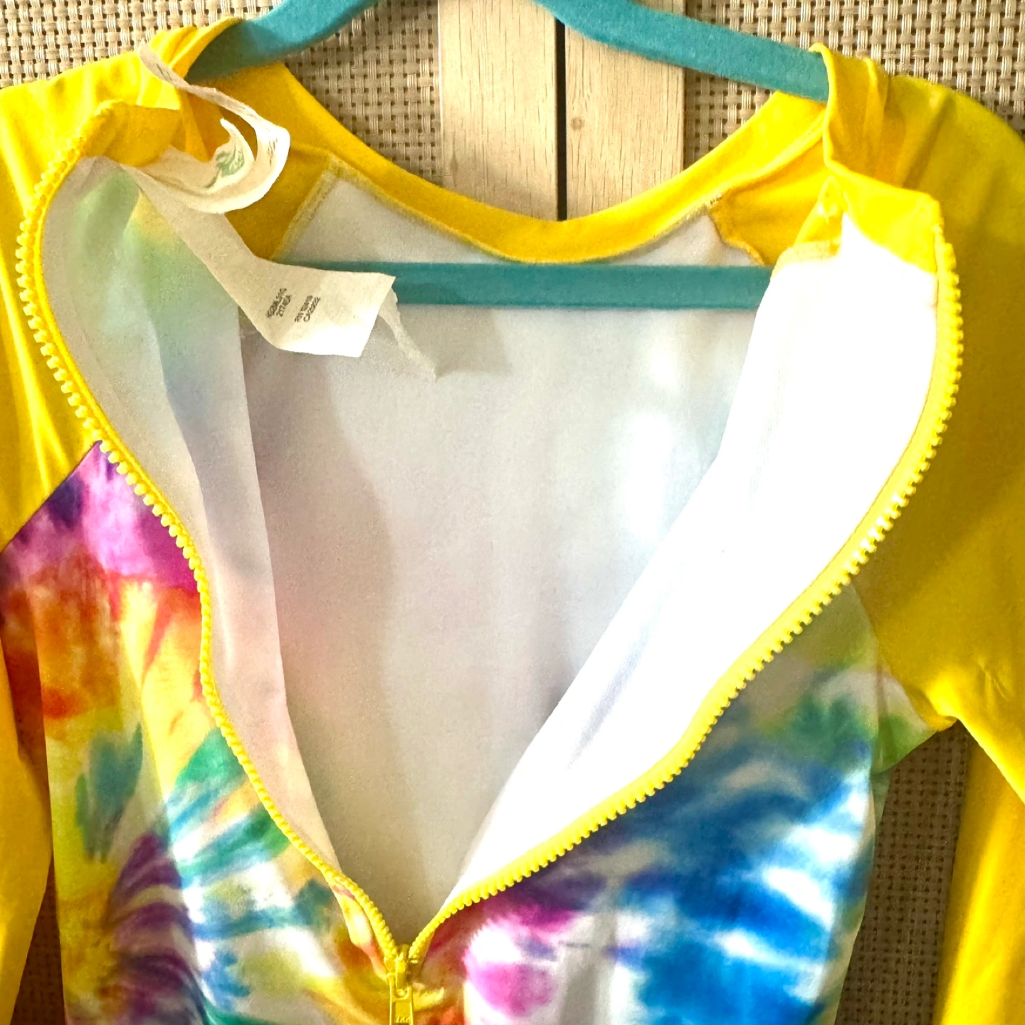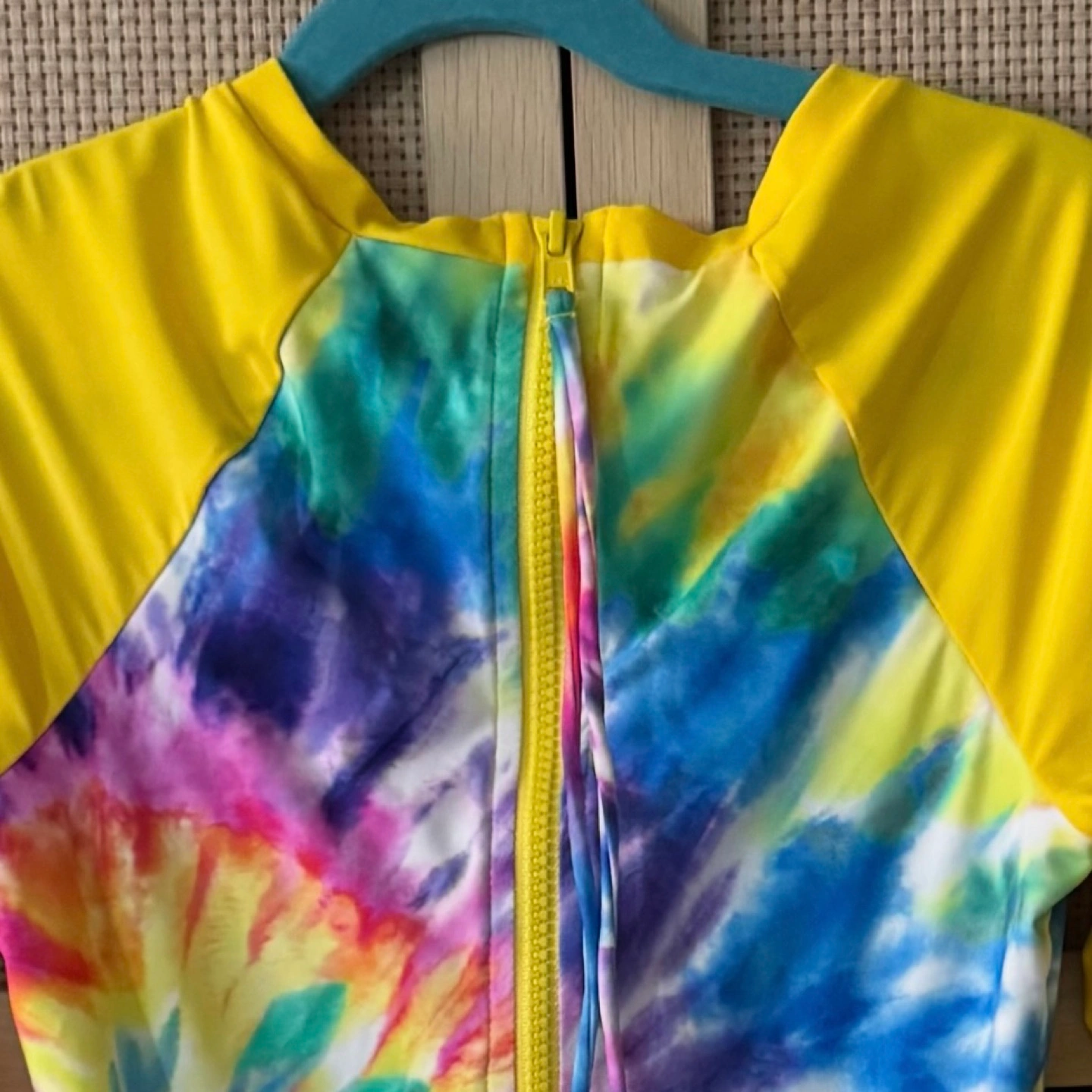 Hobie tie dye rash guard swimsuit. Bright yellow long sleeves. Colorful tie dye center. Zipper in the back. Enjoy wearing this swimsuit while spending a relaxing day at the beach or pool. Worn only a few times. Excellent condition.Retailed for $56
