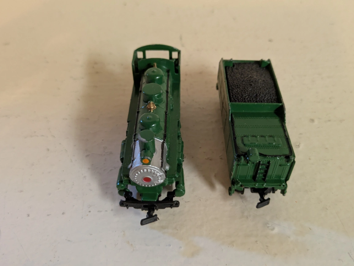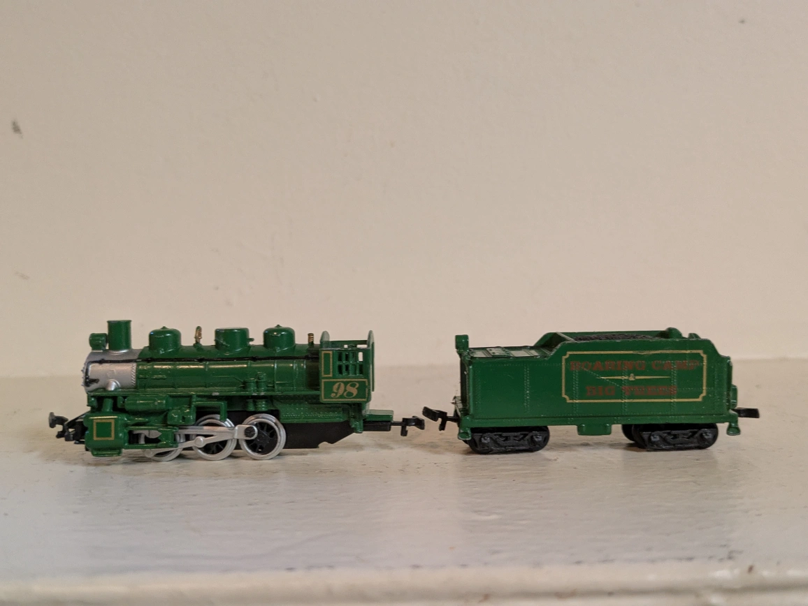 A vintage green Maisto On Track die cast train engine and with a coal car. Features the number 98 on Engine and Roaring Camp Big Trees.