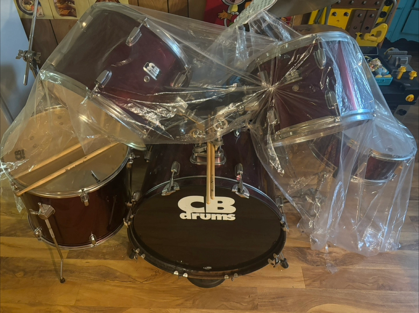 A beautiful drum set in a deep red colour. Appears to be covered in plastic. A great item for relaxation and self-expression.