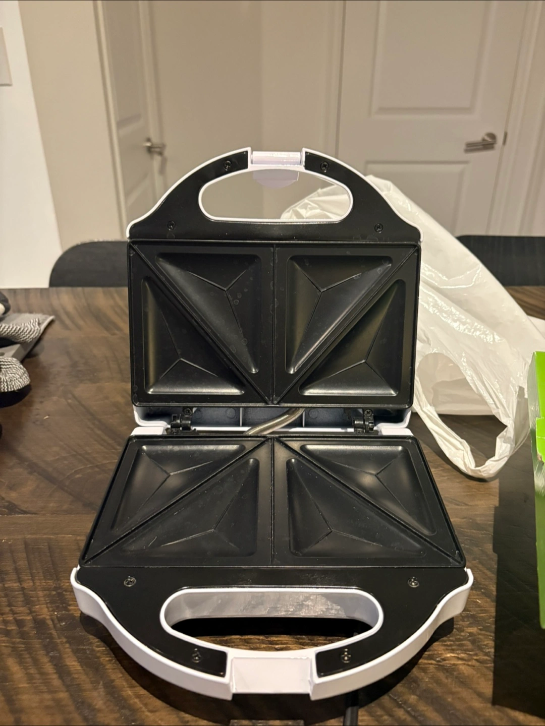 A sandwich maker in good condition. Black cooking surfaces and white accents. A simple appliance for making quick and easy meals to help simplify your busy life.