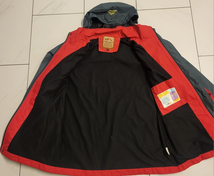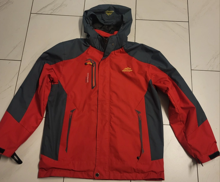 Outdoor jacket in red and grey colors. Features a hood and multiple pockets. The jacket is water-resistant. A perfect companion to enjoy a leisurely walk on a rainy day.