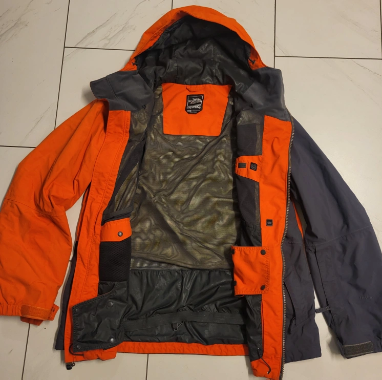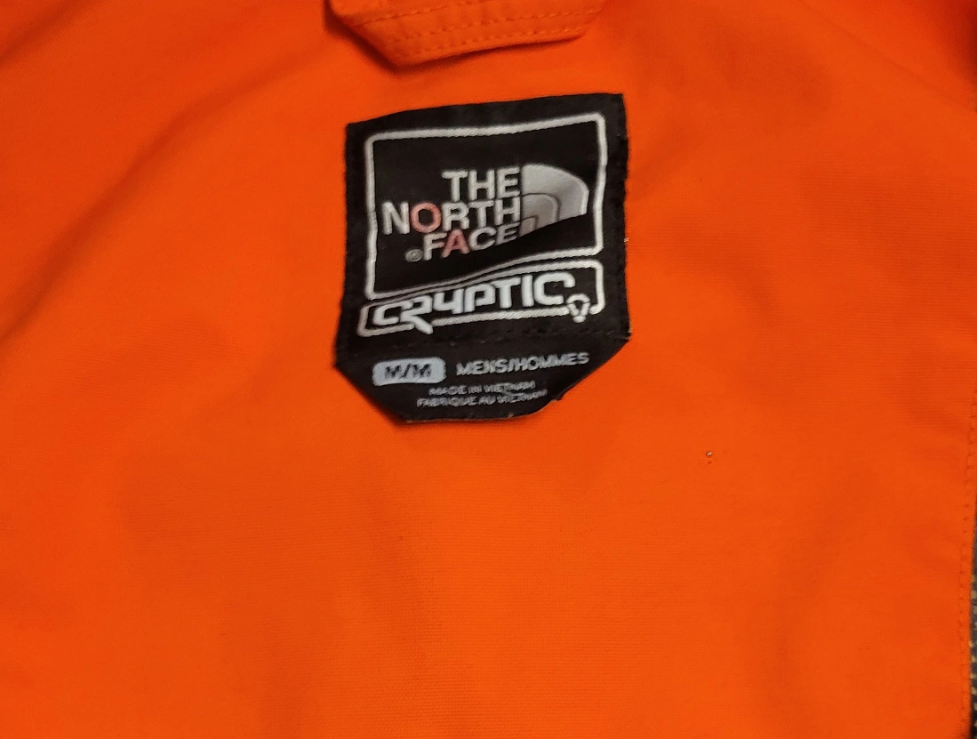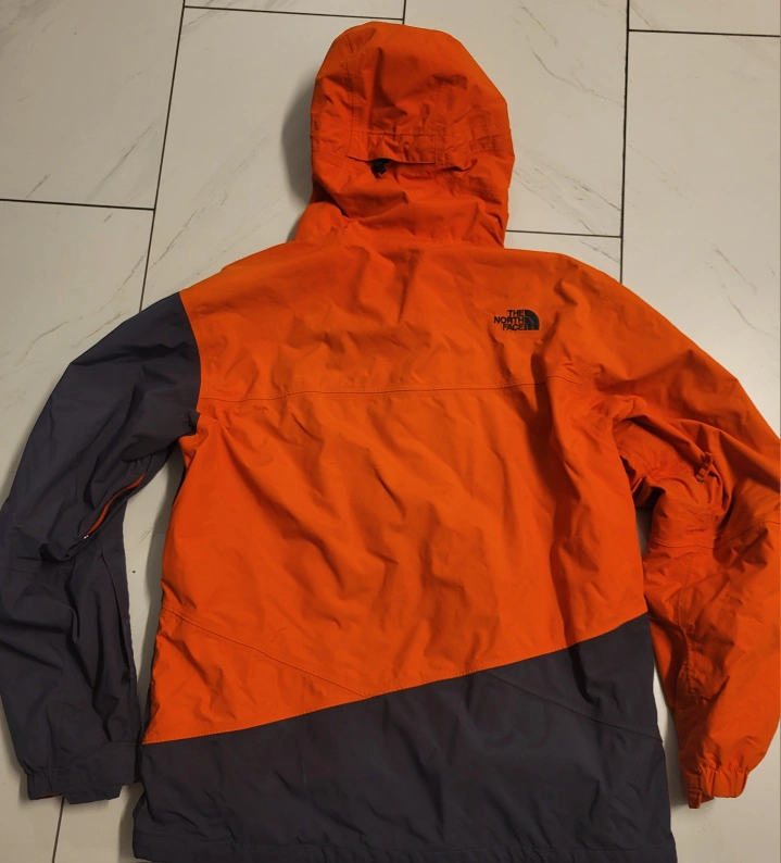Bright orange and dark grey jacket. Features a hood and multiple pockets. Perfect for a peaceful walk through nature. S but fits Medium