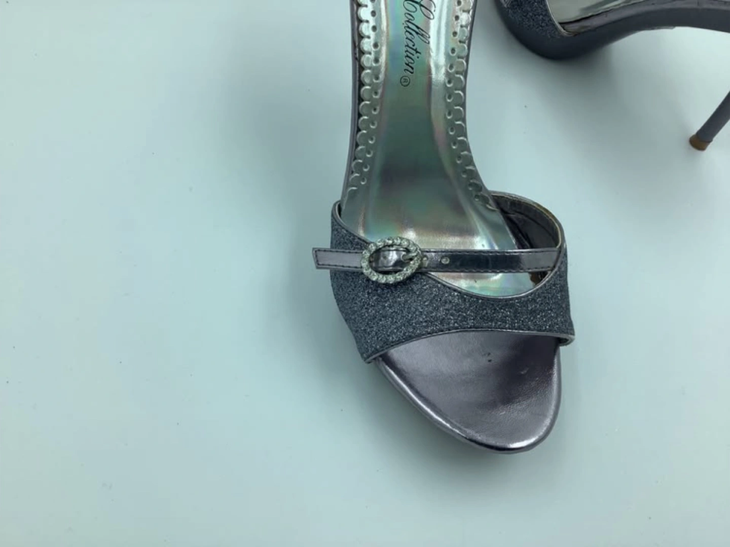 A pair of heels with a sparkly texture. Featuring a purple metallic design, high heels, and a strap detail with a small jewels. Great for a night out.