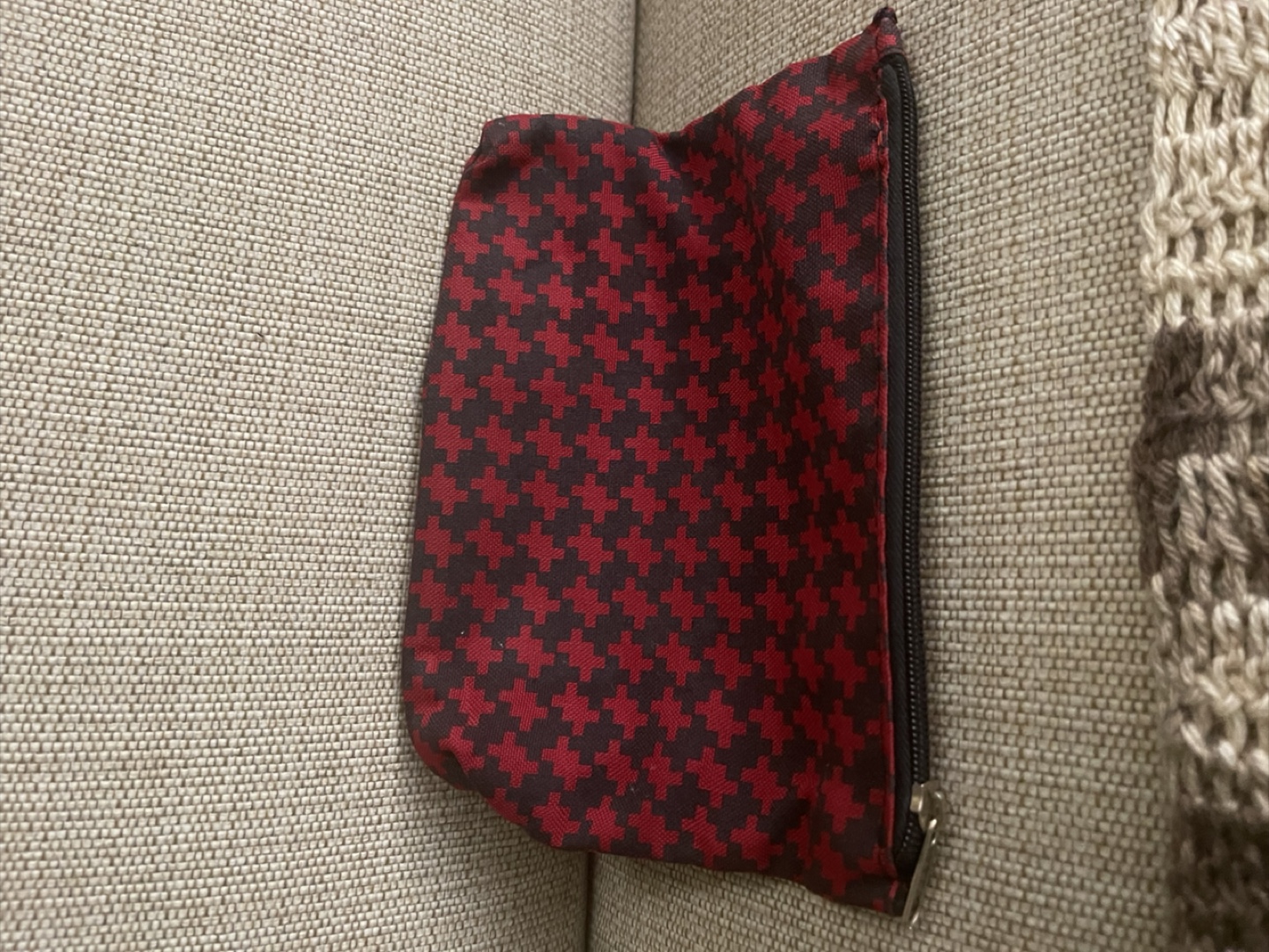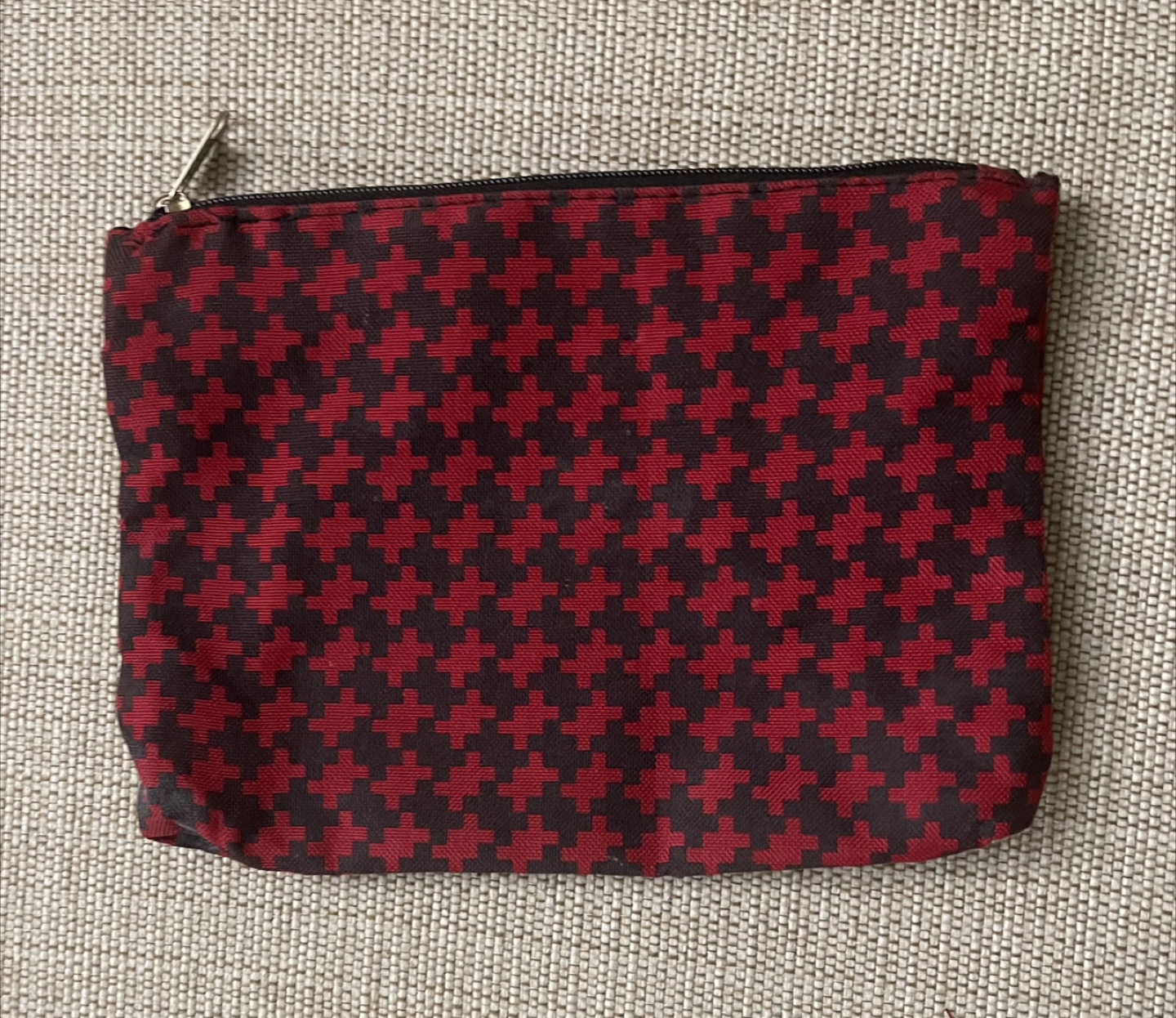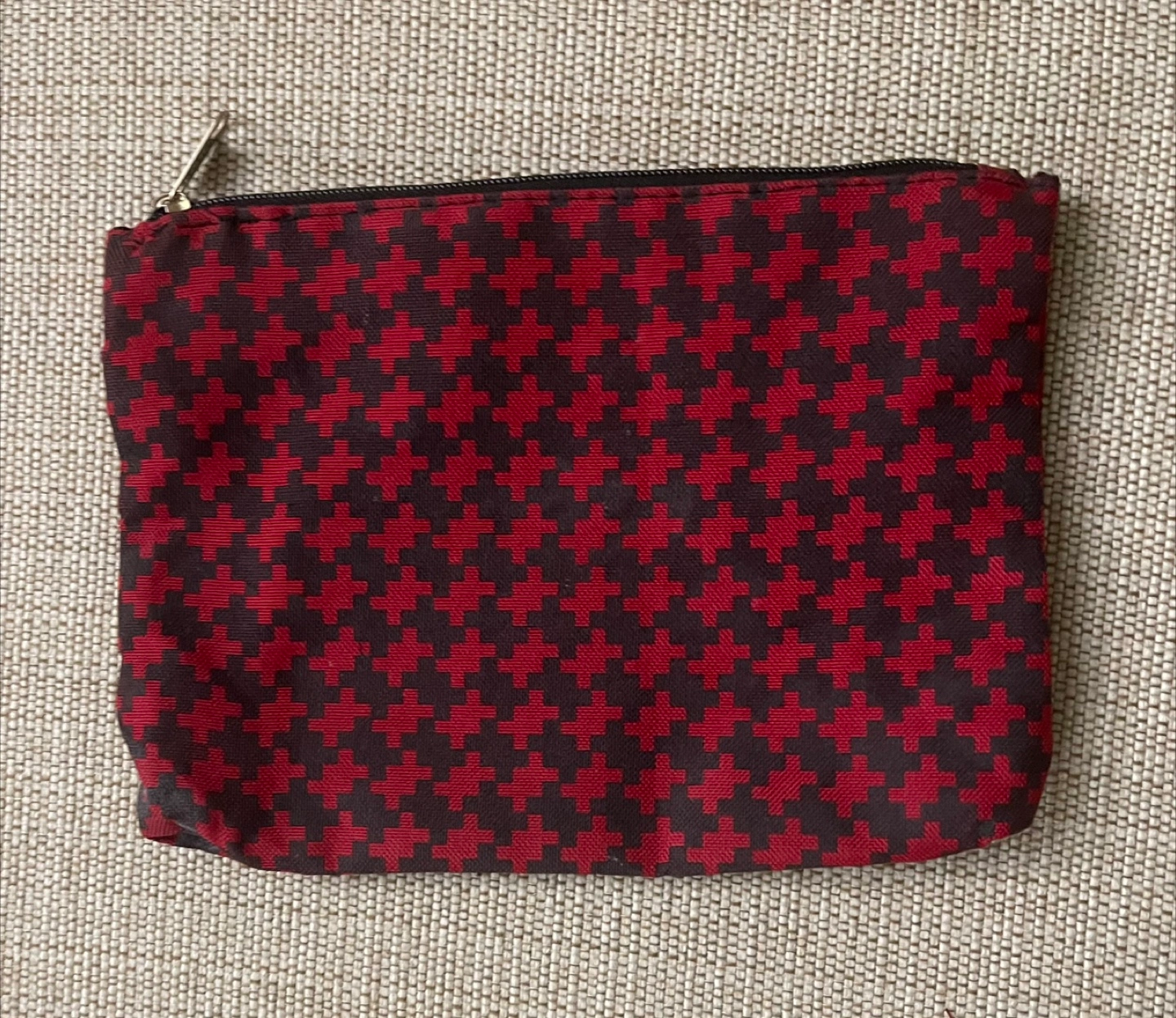 Red houndstooth zipper pouch / cosmetic bag. Red and black houndstooth pattern. Zipper closure, black lining. Perfect for storing makeup and organizing smaller essentials. Excellent condition. From smoke-free, pest-free, and pet-free home.