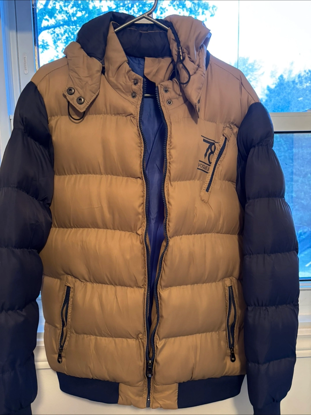Puffer jacket with a hood. The jacket is tan with navy blue sleeves and trim. Features a zipper closure and pockets. I hope you find the perfect new home for this great jacket to keep you warm.