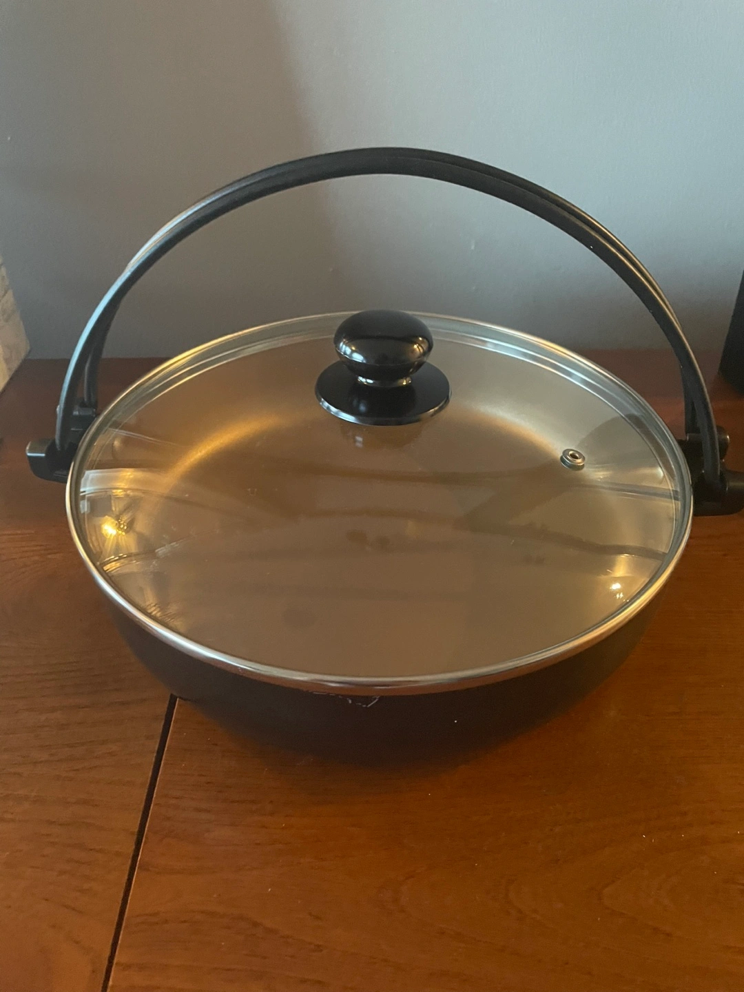 Round black electric pan with a clear lid. Features black handles. The bottom has a patterned design. Making use of this pan is perfect for a delicious meal that you can make to relax at home.