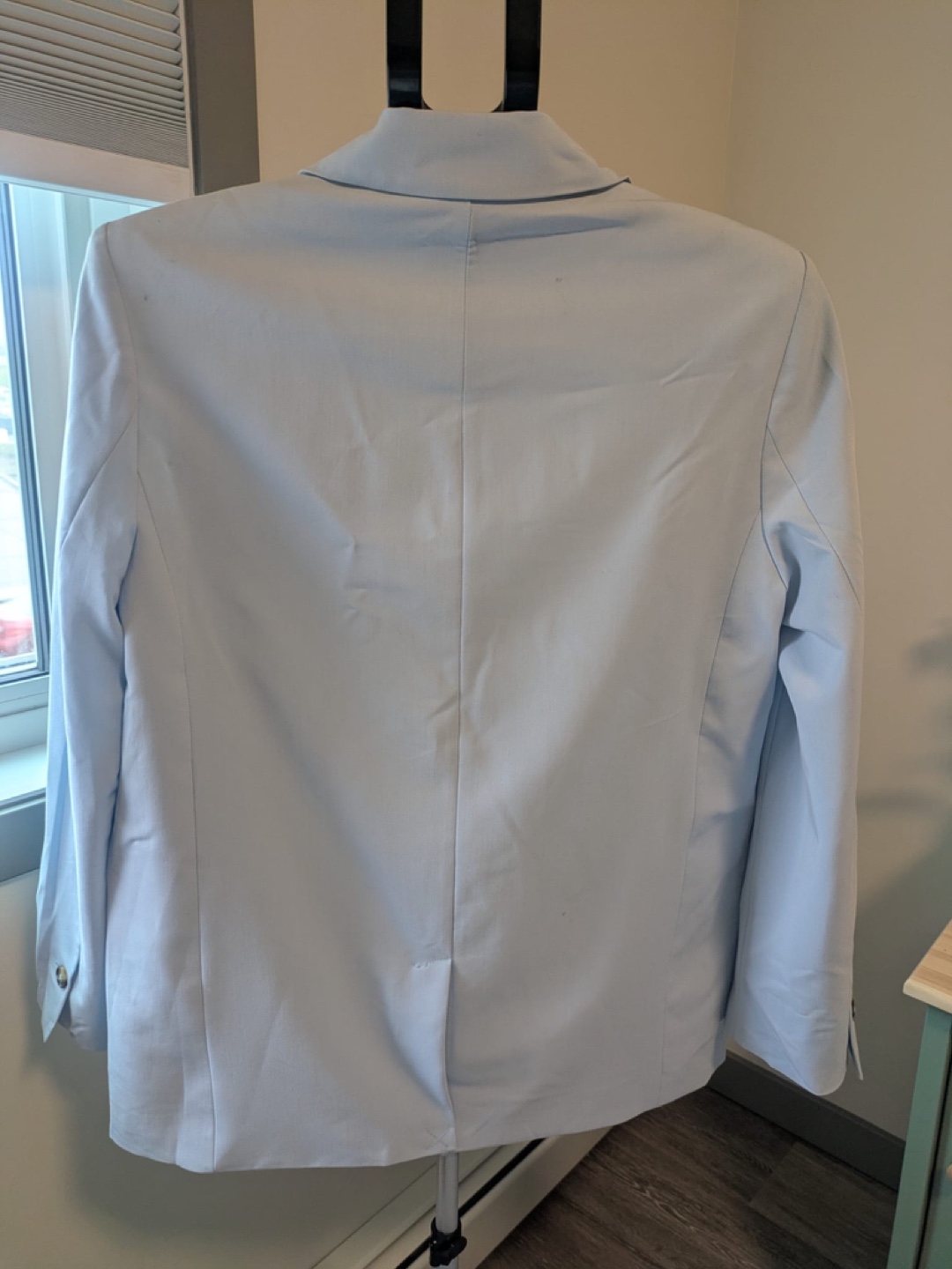 This navy blazer offers a tailored fit that enhances your silhouette, making it a versatile addition to any wardrobe. The classic lapels add a touch of sophistication, perfect for both professional and casual settings. Crafted with attention to detail, this blazer ensures comfort and style in every wear. Light blue blazer. Has two front pockets. Features buttons. A great choice for a simple yet elegant outfit to bring you peace.