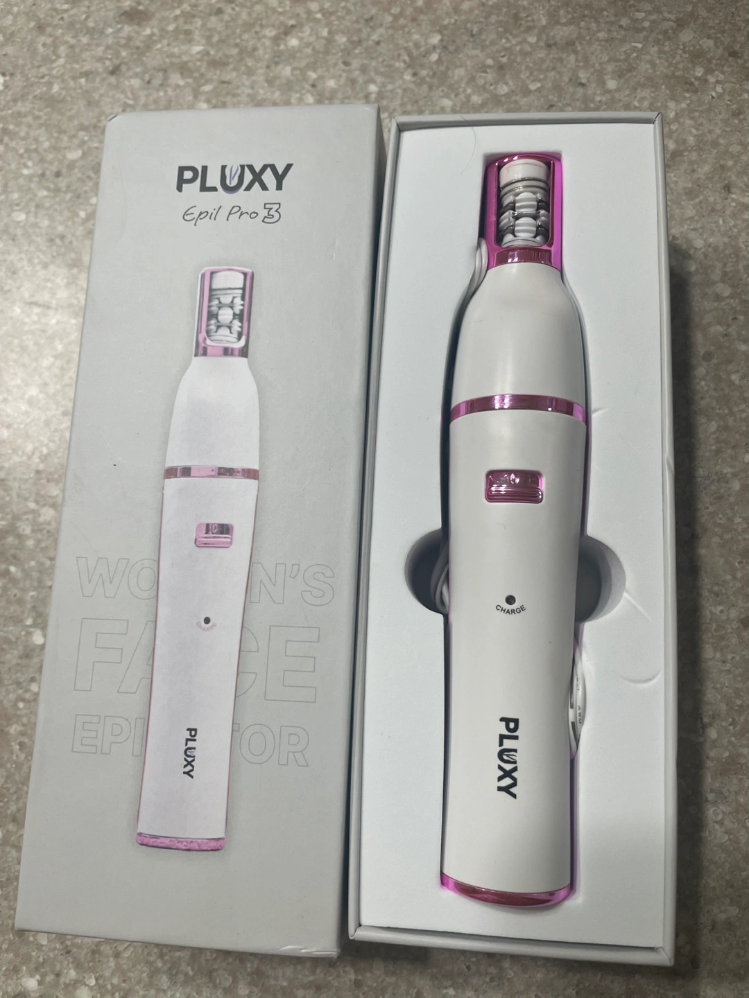 A brand new in box epilator. The device has a white body with pink accents. Comes with a charging cable and small brush. An epilator like this can be a relaxing way to take care of some self-care.