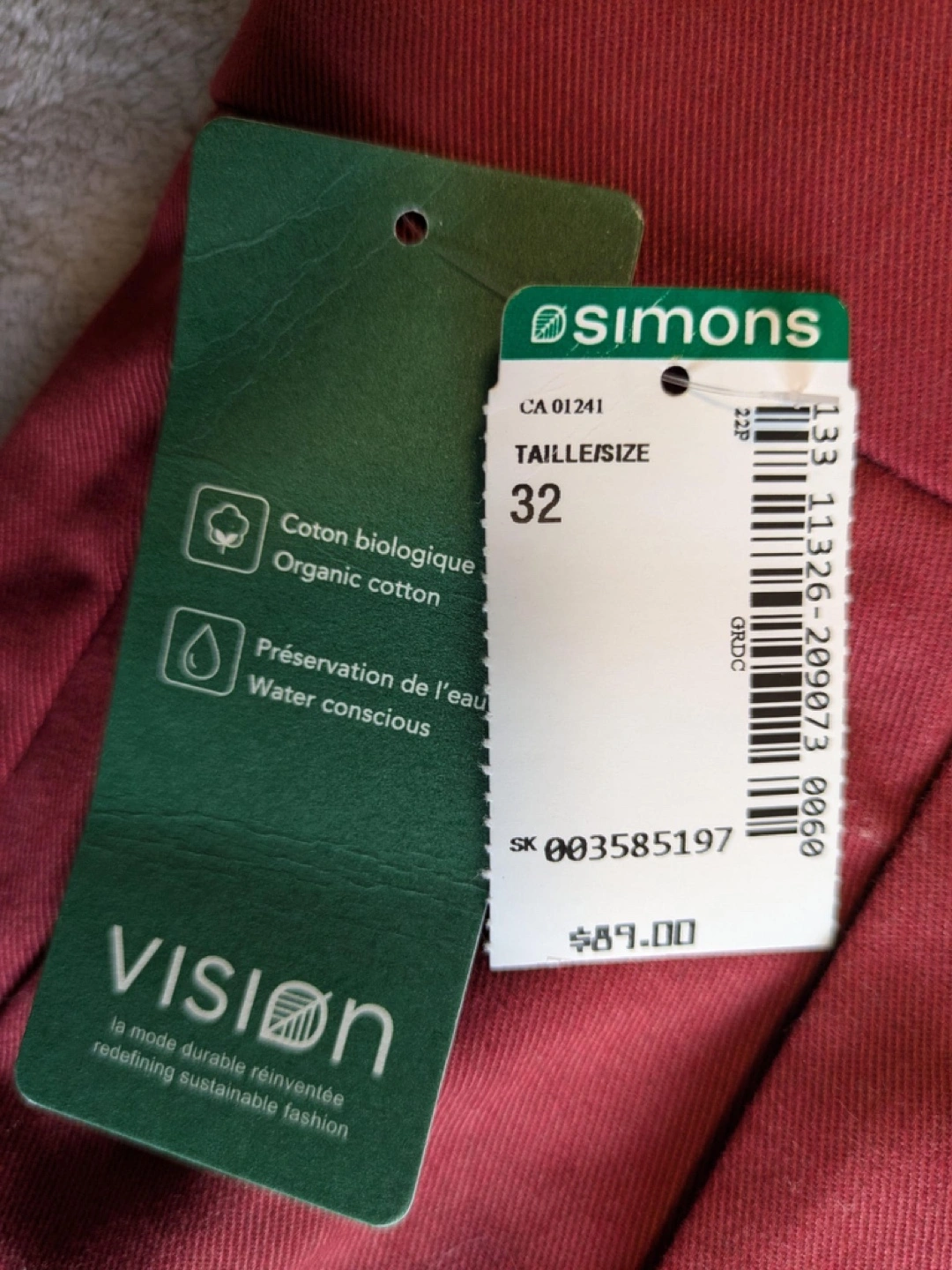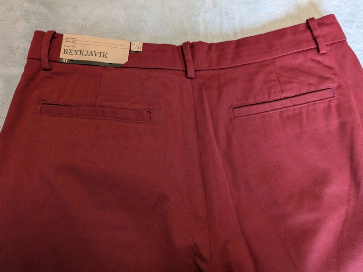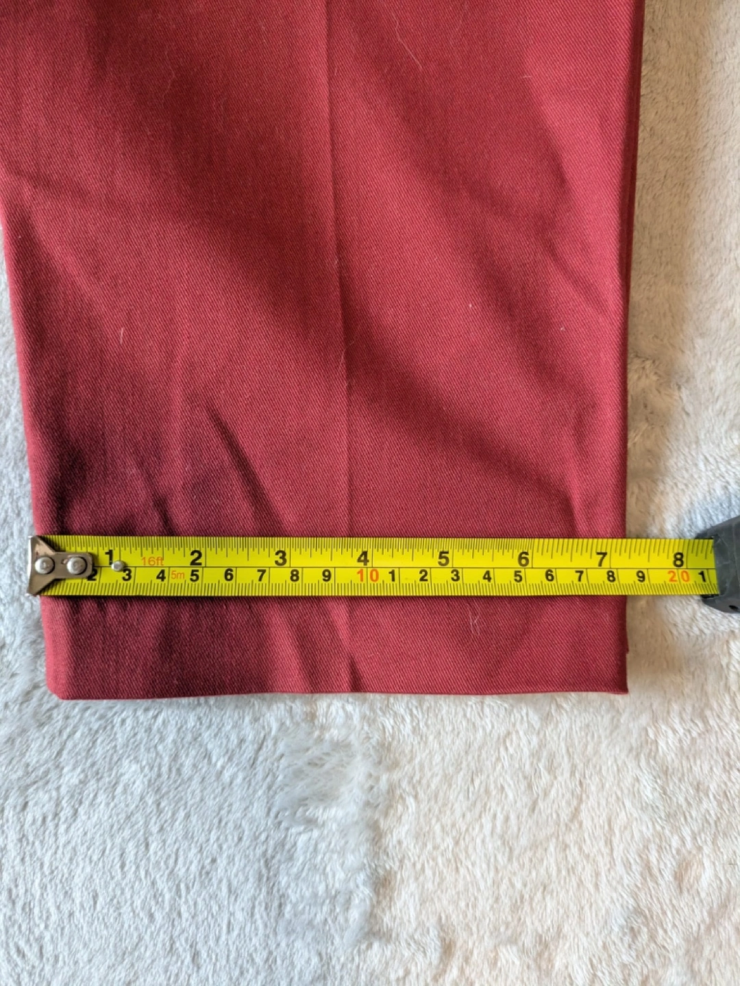 These red chinos feature a relaxed fit with a slightly tapered leg, offering a stylish and comfortable look. The vibrant color makes them a standout piece, perfect for adding a pop of color to any outfit. The cuffed hem adds a trendy touch to these versatile pants. Trousers in a beautiful shade of red. The back features two pockets, and the tag is still attached. You could wear these in the sun to feel a deep sense of peace.