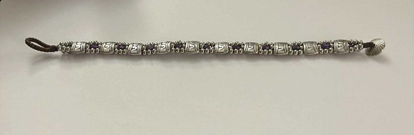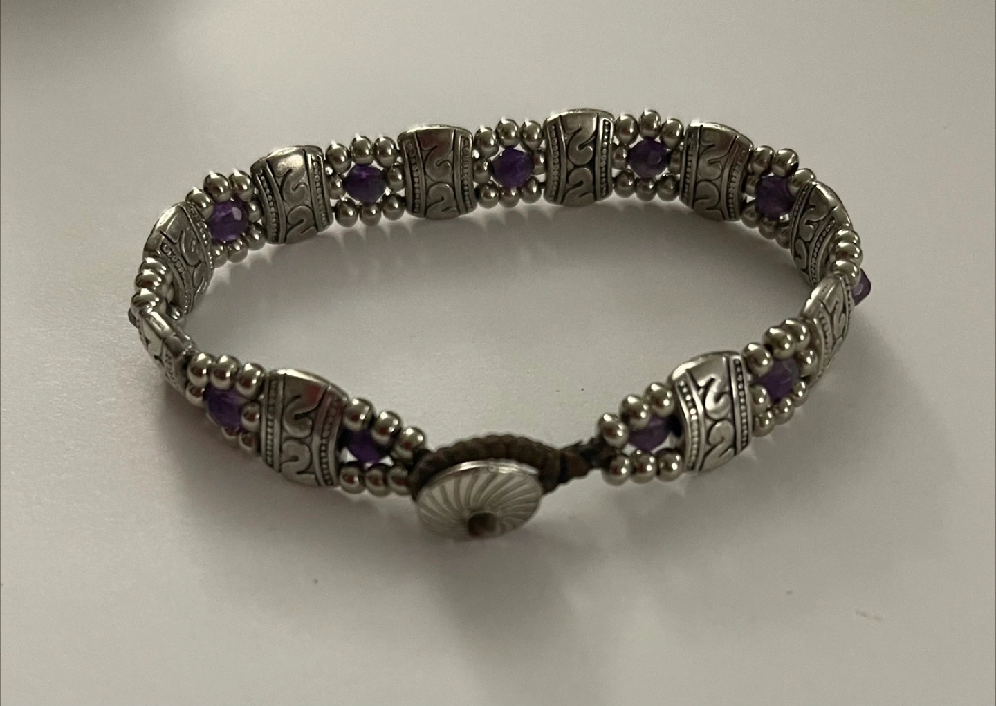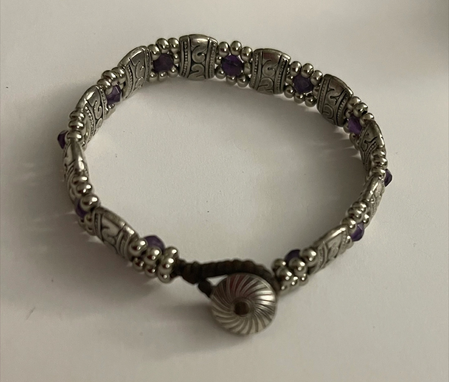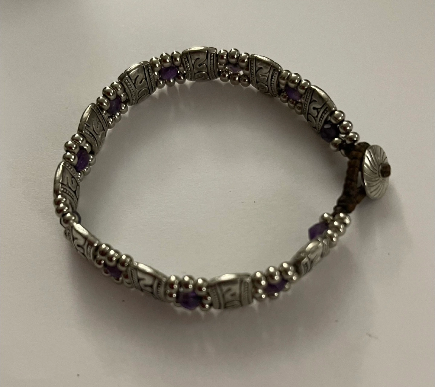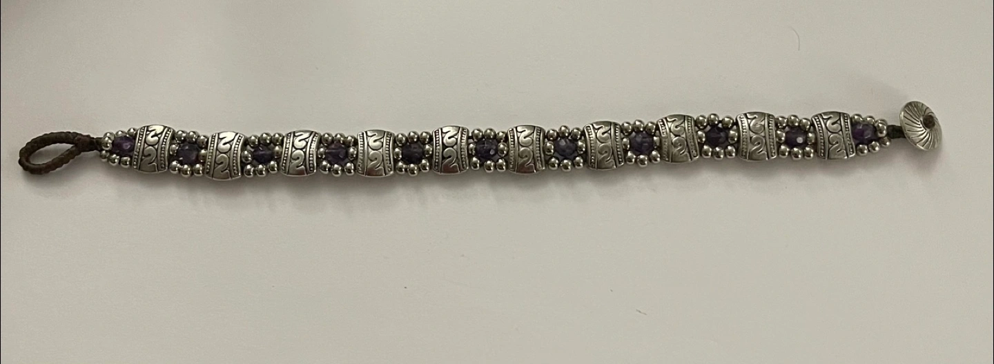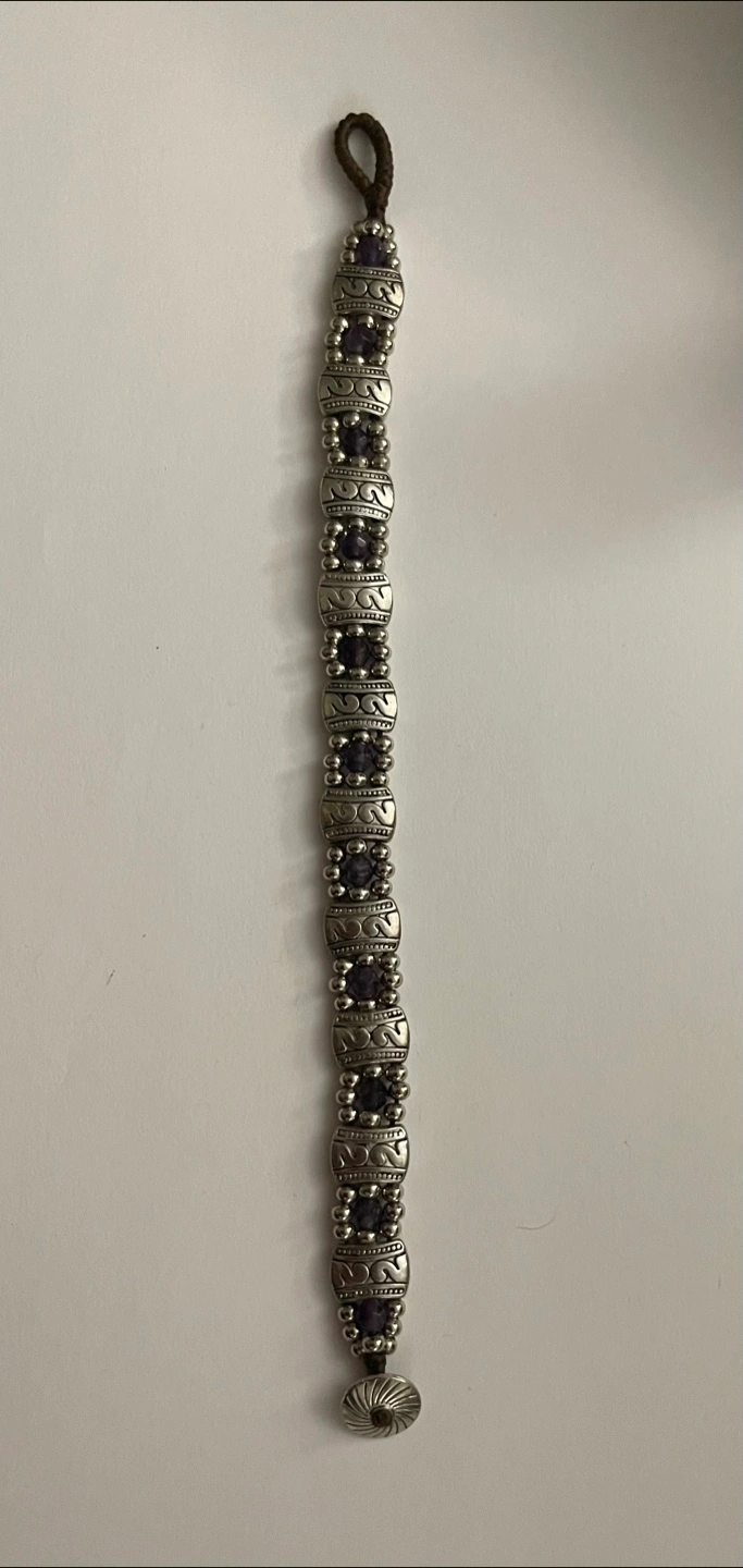 Bracelet with silver links. Each link has an engraved design. Contains small purple stones. The clasp appears to be made of leather. A beautiful piece to wear everyday. From smoke-free and pet-free home. Excellent condition.