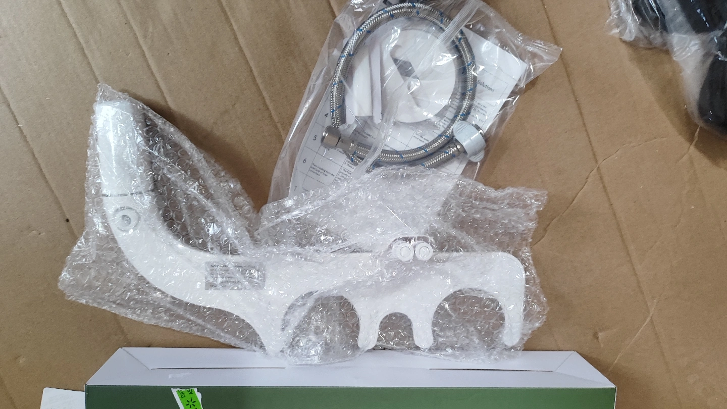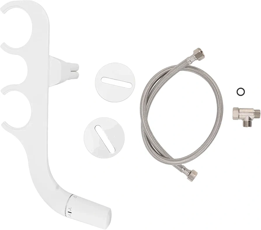 White bidet attachment, ready to install. Included are different components, ready to be attached. You may find a sense of cleanliness in this product.