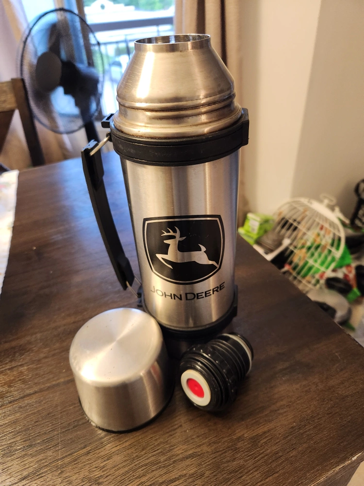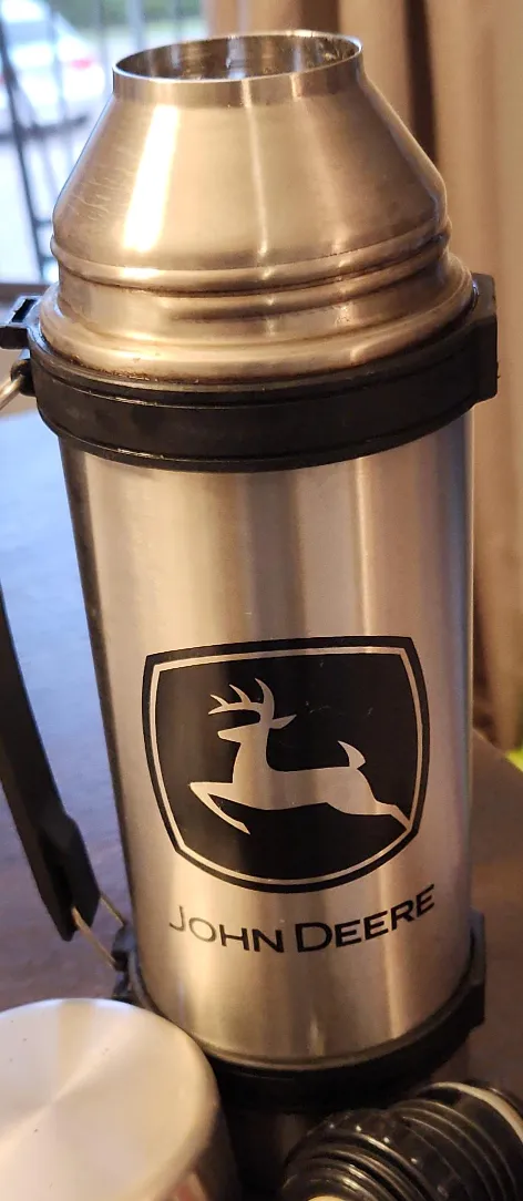 Stainless steel construction. Features the John Deere logo. Includes a cup and a lid. Bring it with you to enjoy your favourite drink in the outdoors.