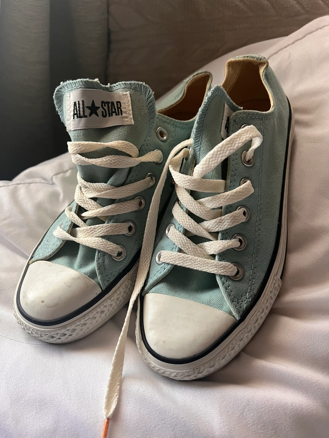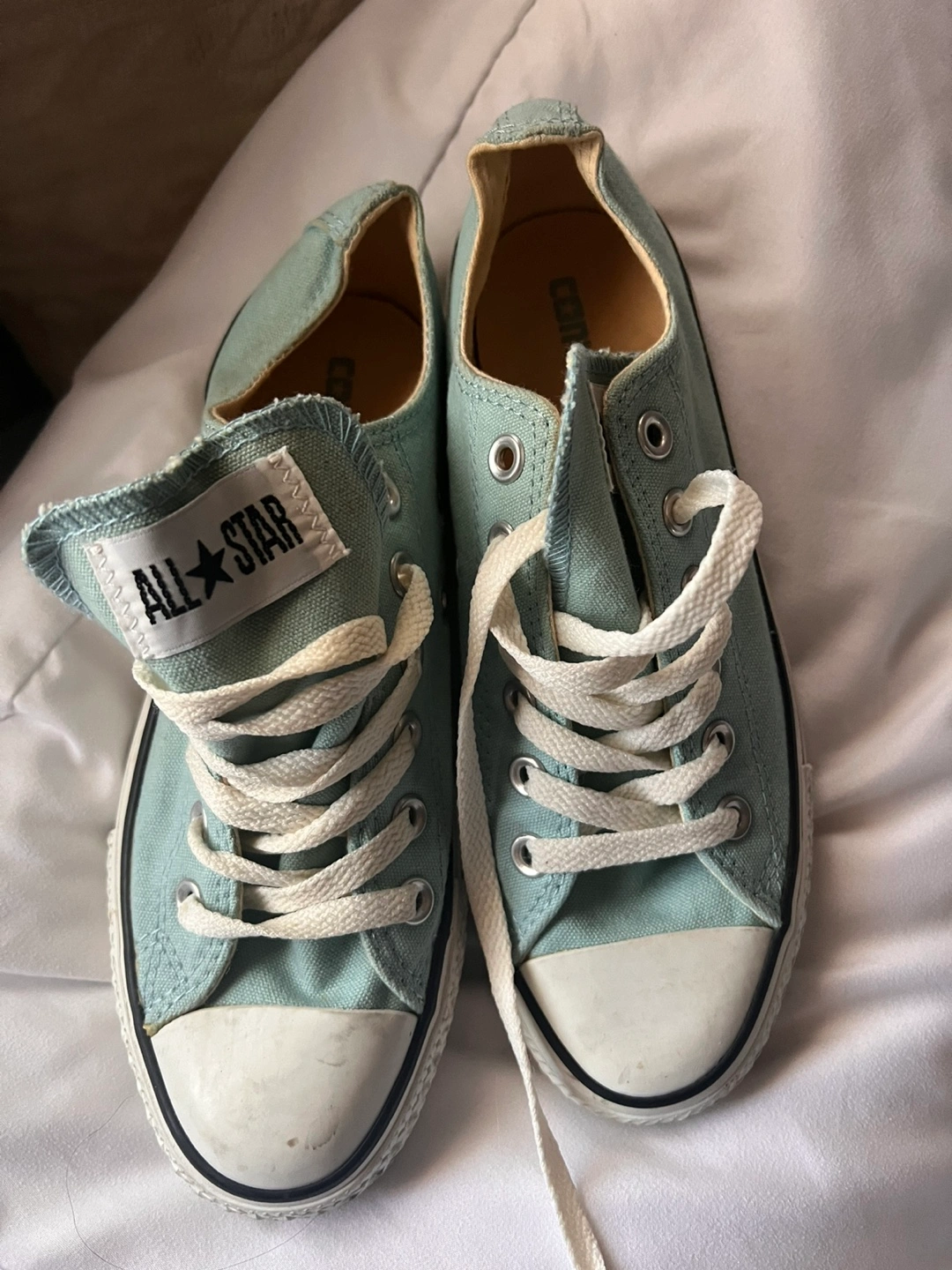 41Soft pastel-coloured canvas shoes. White laces. White toe caps. A stylish and classic pair of shoes that are perfect for everyday wear, and that will look wonderful while you’re out and about. Has a minor stain, as photographed Cash only Pick up Dufferin and Clark