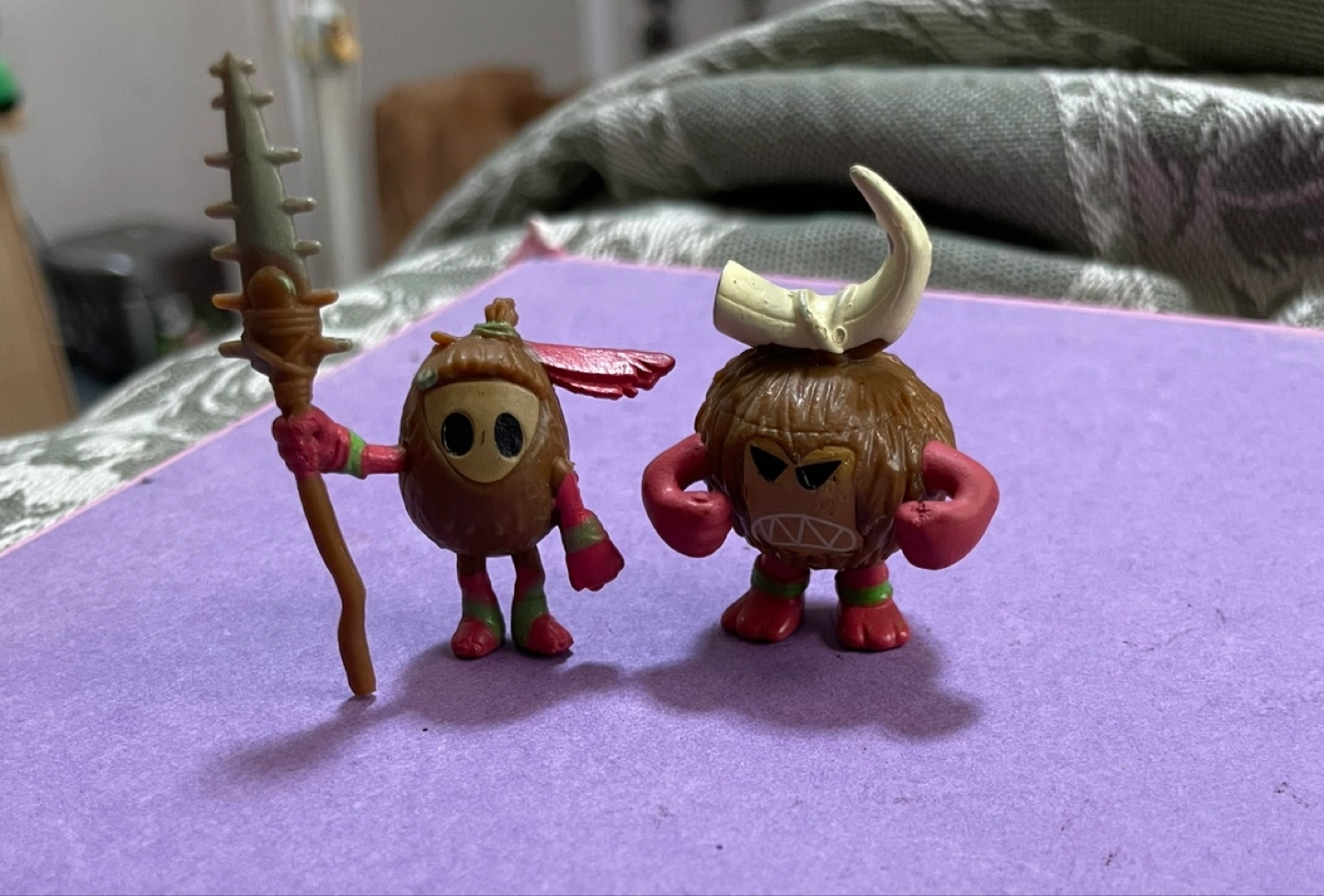 Two small figures, one with a weapon and the other with horns. They are made with vibrant colours and detailed designs. Consider placing them on a shelf for a subtle touch of whimsy. $2 each.