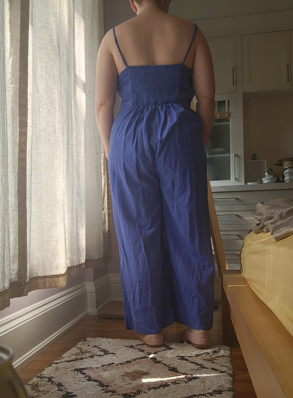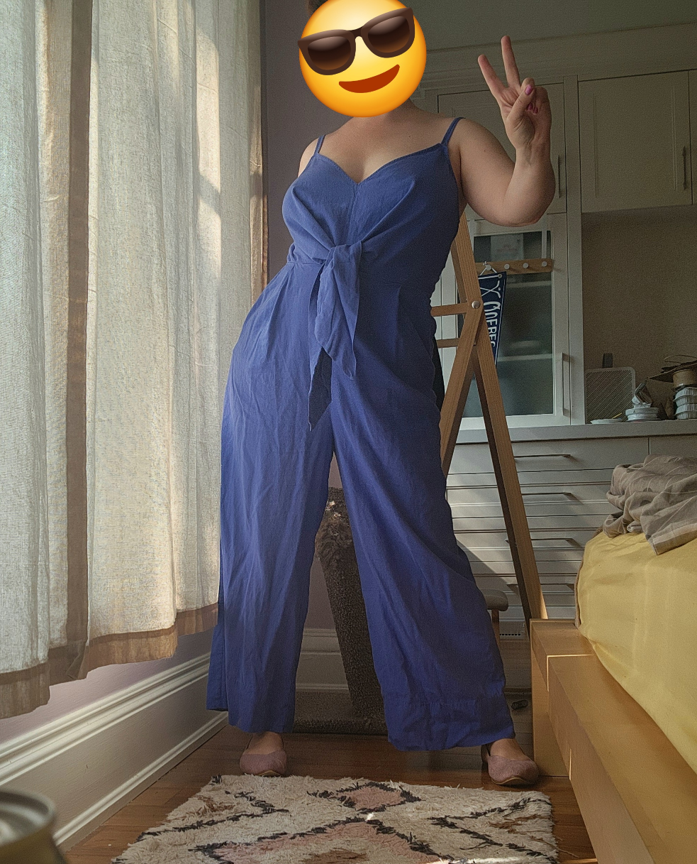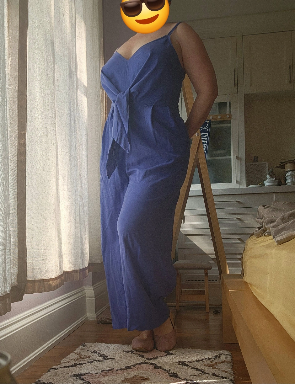 A sleeveless, linen blend jumpsuit from Reitman's, size Large. It's a deep cornflower blue with cute tie detail on the waist. Ajustable straps, wide leg. An effortless summer outfit!